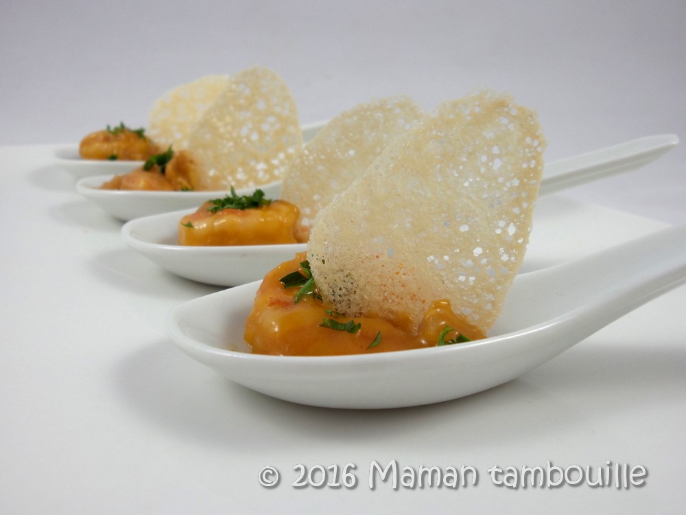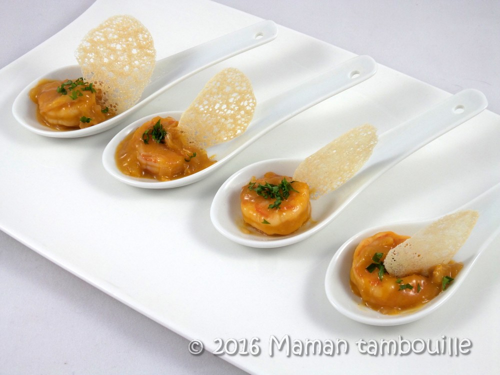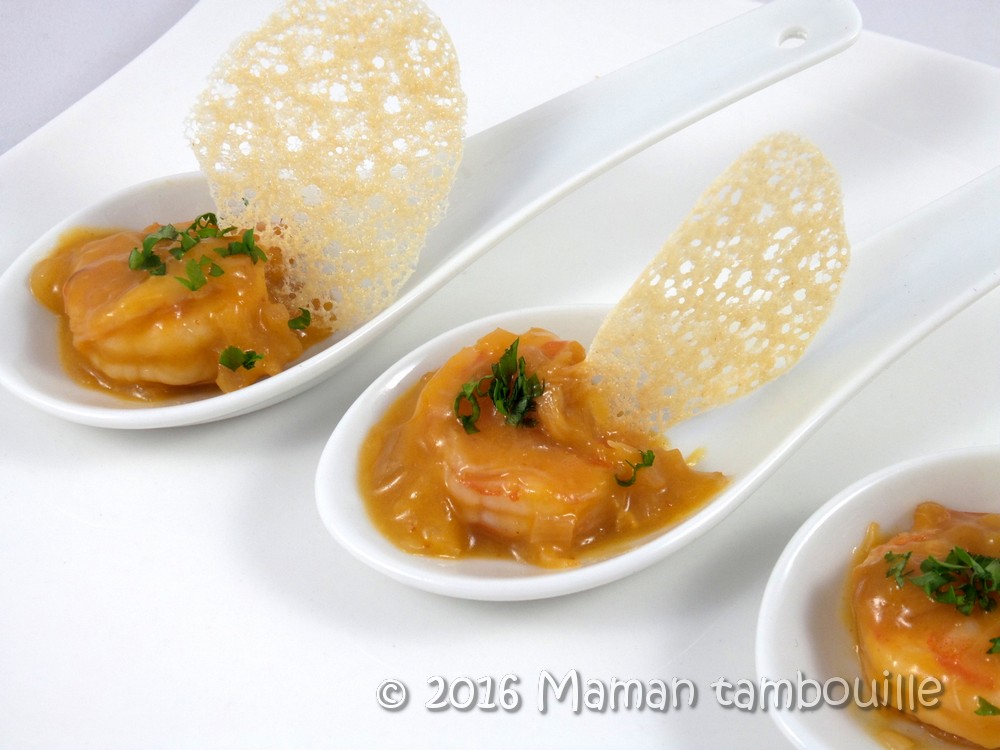 Une nouvelle idée apéritive pour Noël jolie, goûteuse et plutôt rapide à réaliser: des cuillères de crevettes à l’orange et au cognac agrémentées d’une tuile de pain. J’aime beaucoup ces crevettes, c’est une recette dont je ne me lasse pas.