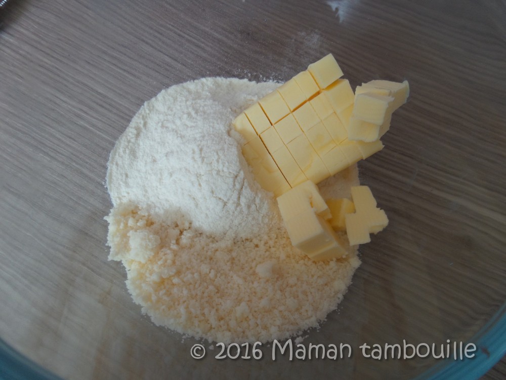 Préparer le crumble en mélangeant le beurre coupé en morceaux, la farine et le parmesan avec le bout de doigts. Le mélange doit devenir sableux.