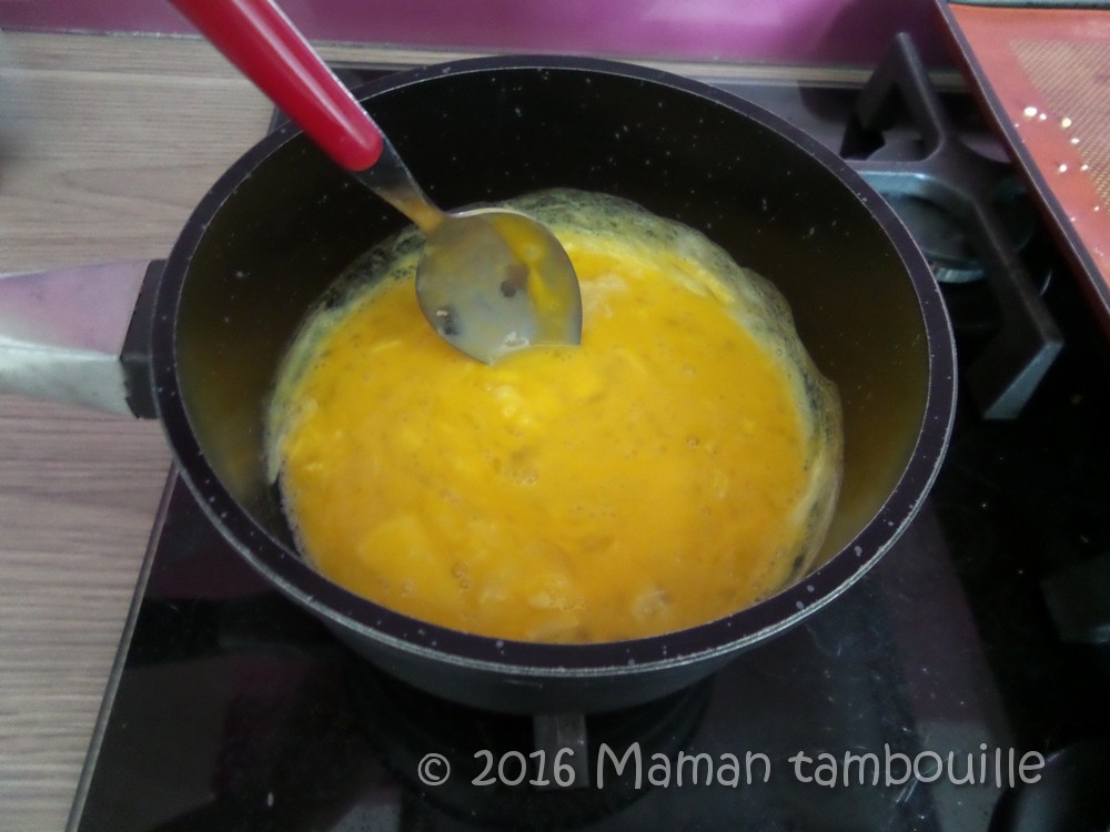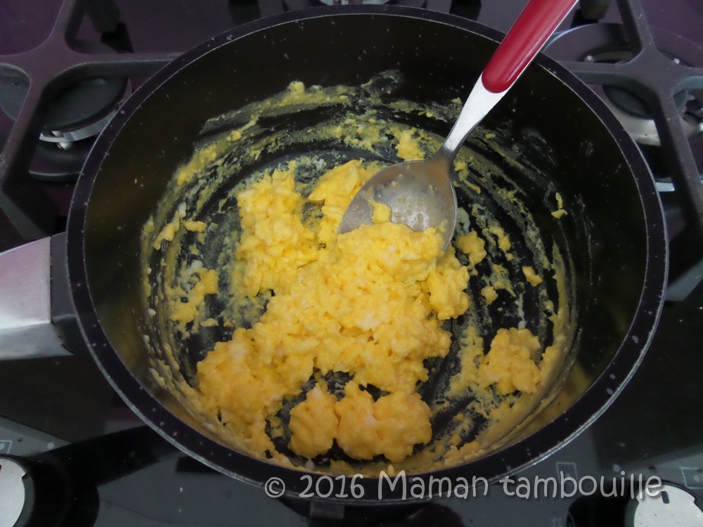 Cuire en mélangeant sans cesse avec une cuillère jusqu’à ce que les œufs soient cuits en faisant attention qu’ils ne deviennent pas trop secs non plus. Ils doivent rester moelleux et onctueux.
