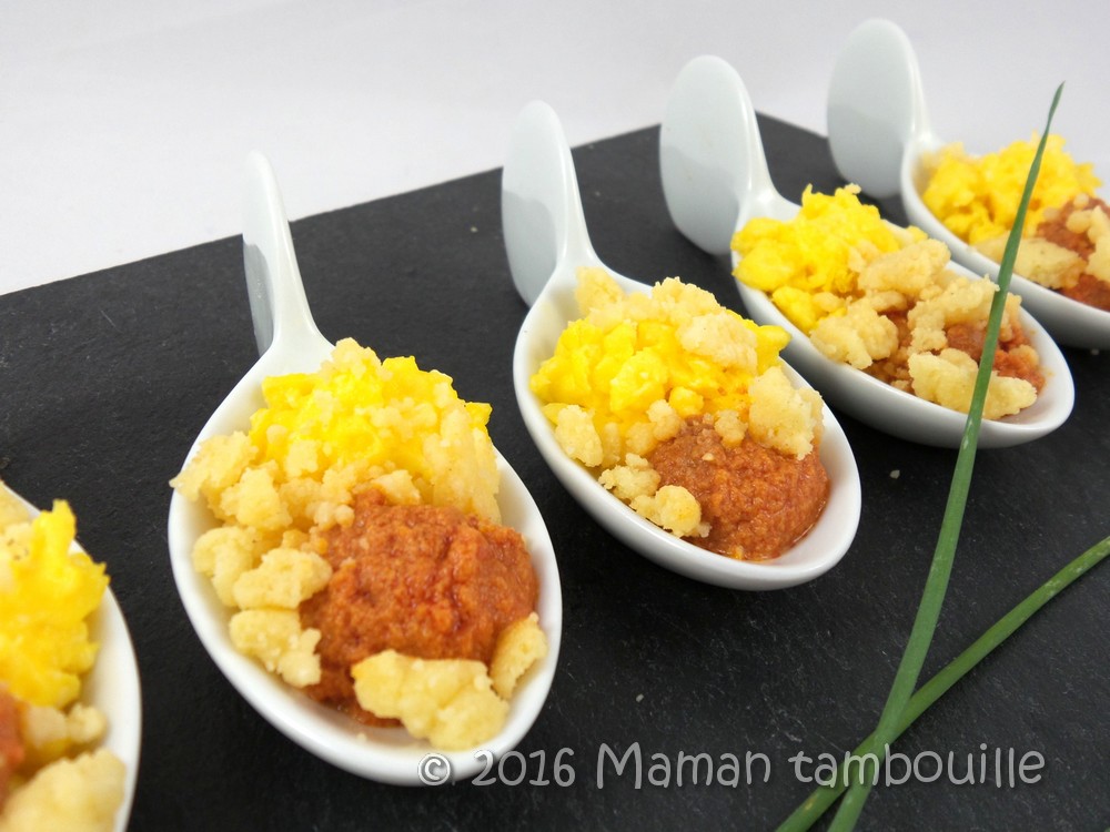 Vous pouvez aussi servir en verrine en mettant de la crème de poivrons dans le fond, des œufs au milieu et du crumble pour finir.