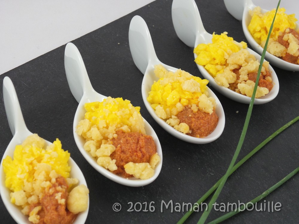 Envie de changer un peu des cacahuètes et chips pour l’apéro ? Je vous propose des petites cuillères apéritives avec des œufs brouillés, de la crème de poivrons et un crumble au parmesan.