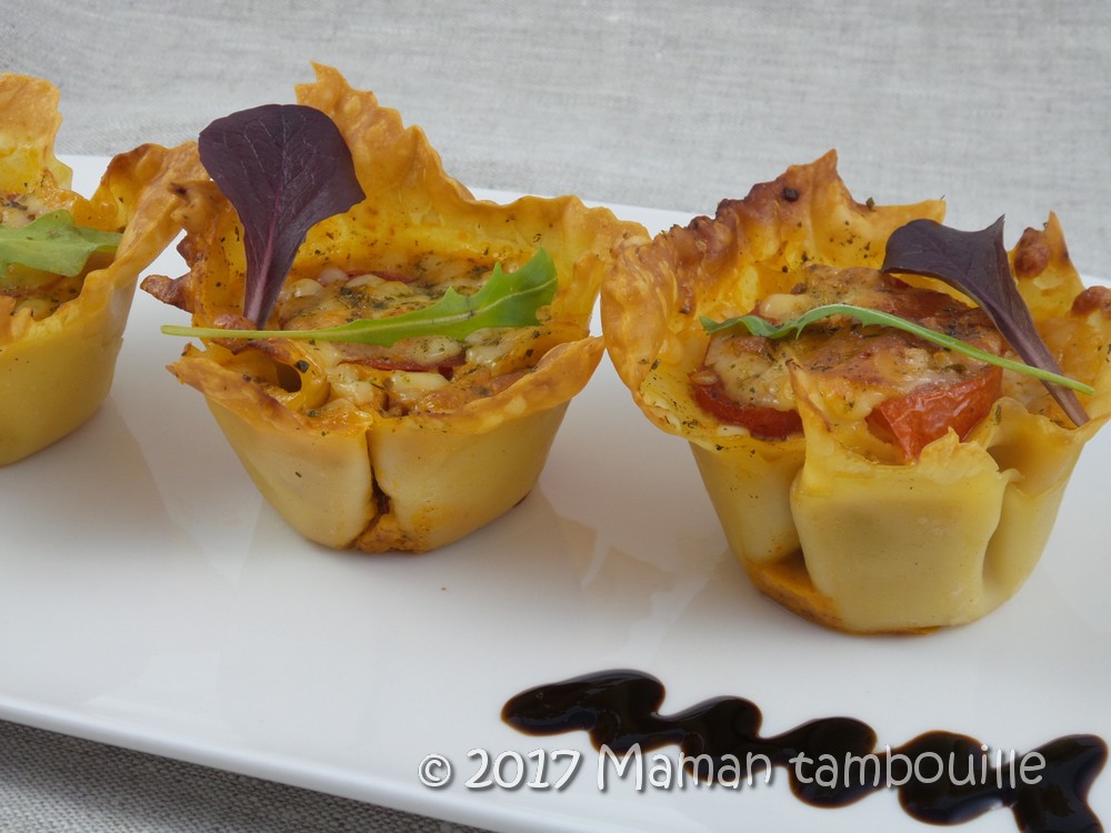 Couper chaque feuille en 2 et mettre 2 moitiés en les superposant un peu dans des moules à muffins. Remplir de sauce.