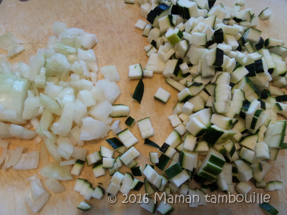 Emincer l’oignon en petits dés. Laver les courgettes et les couper en petits dés.