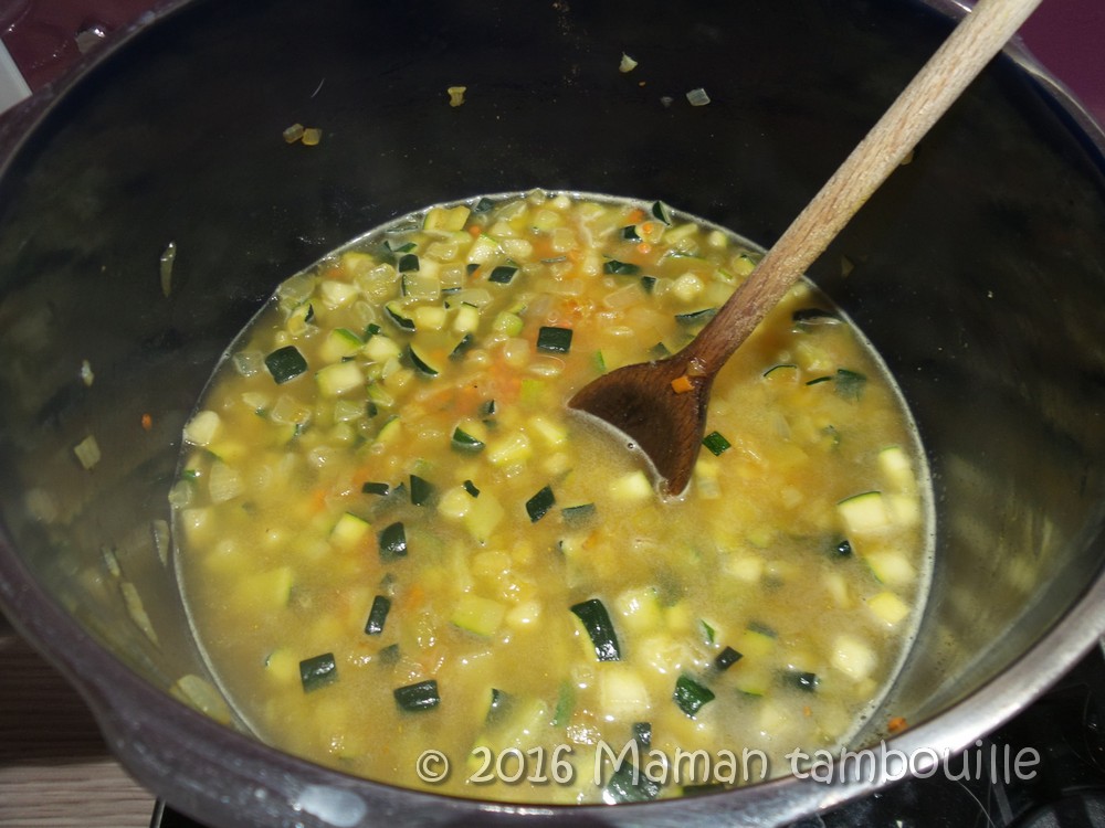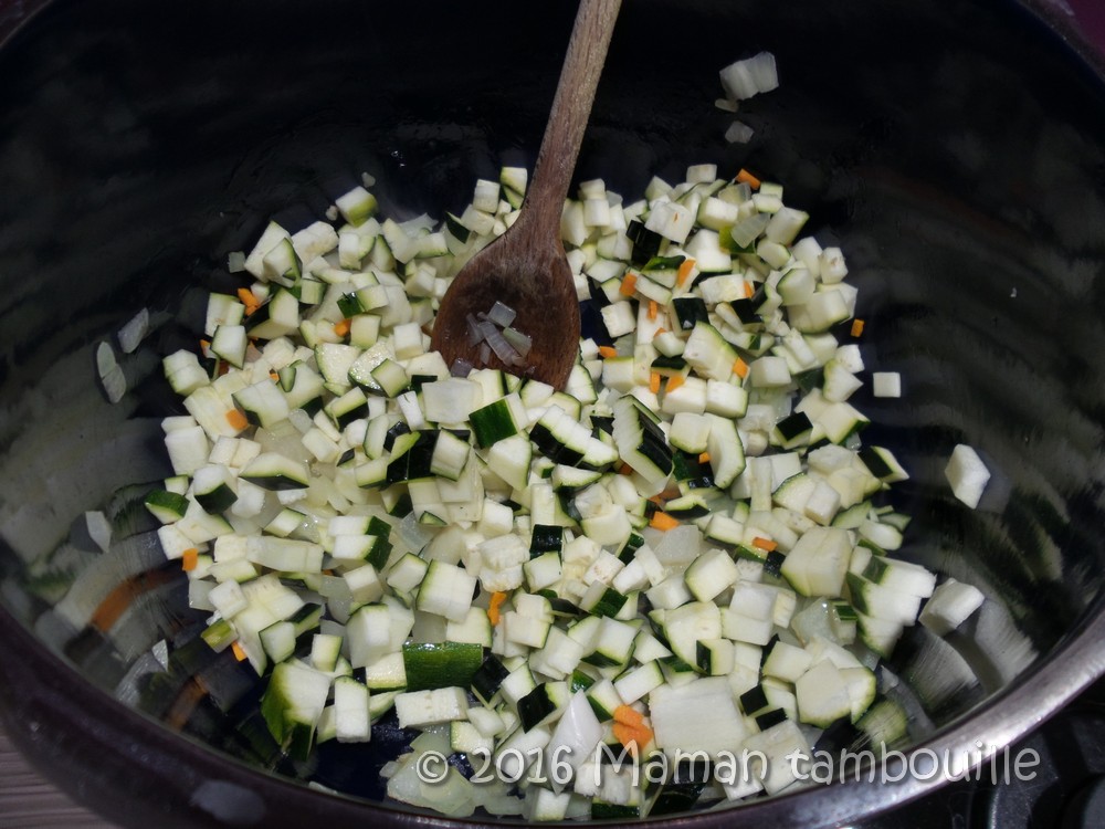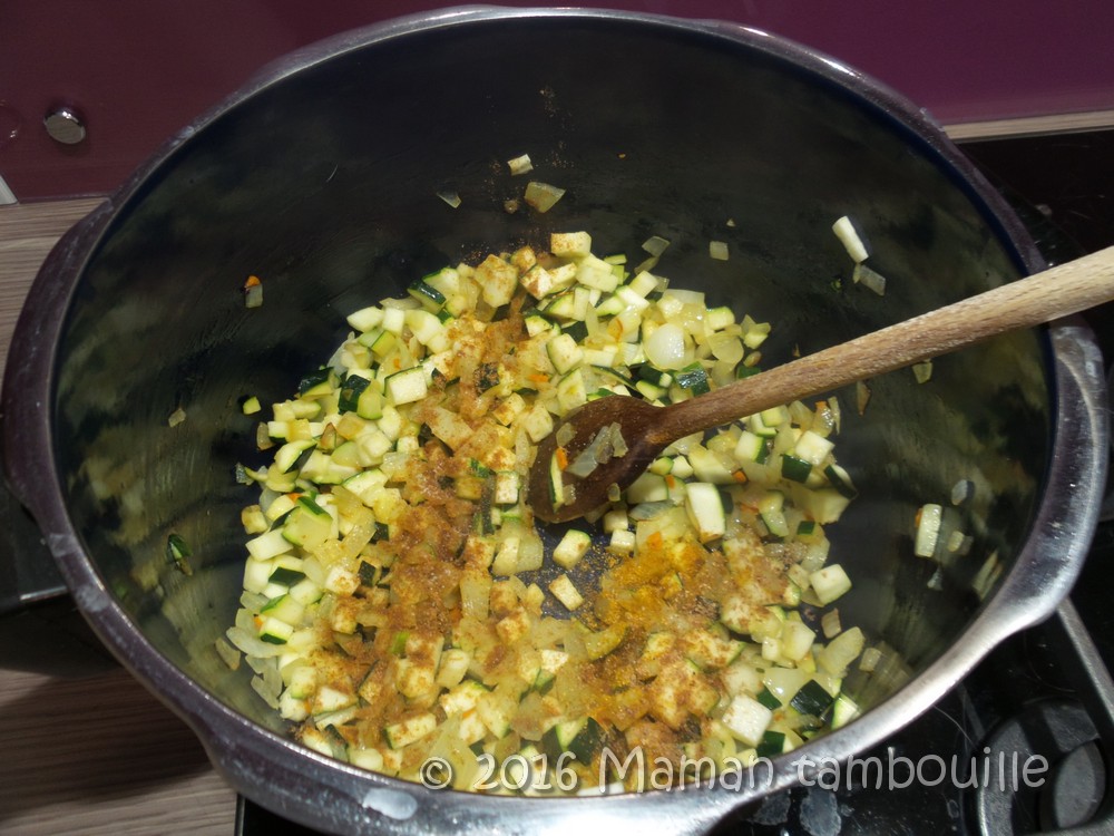 Dans un auto cuiseur (ou une casserole), chauffer de l’huile d’olive. Ajouter les oignons, les courgettes et le curcuma. Faire cuire 5 min.