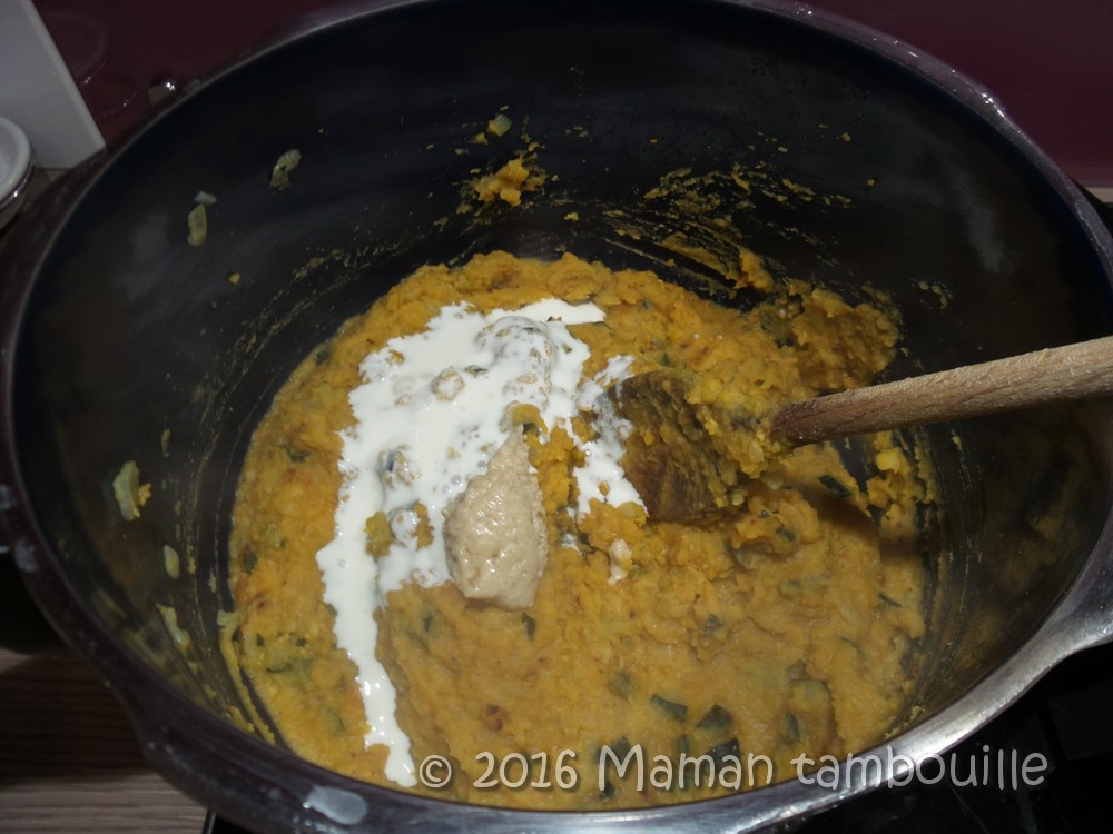 Ajouter la crème de soja et le tahini.