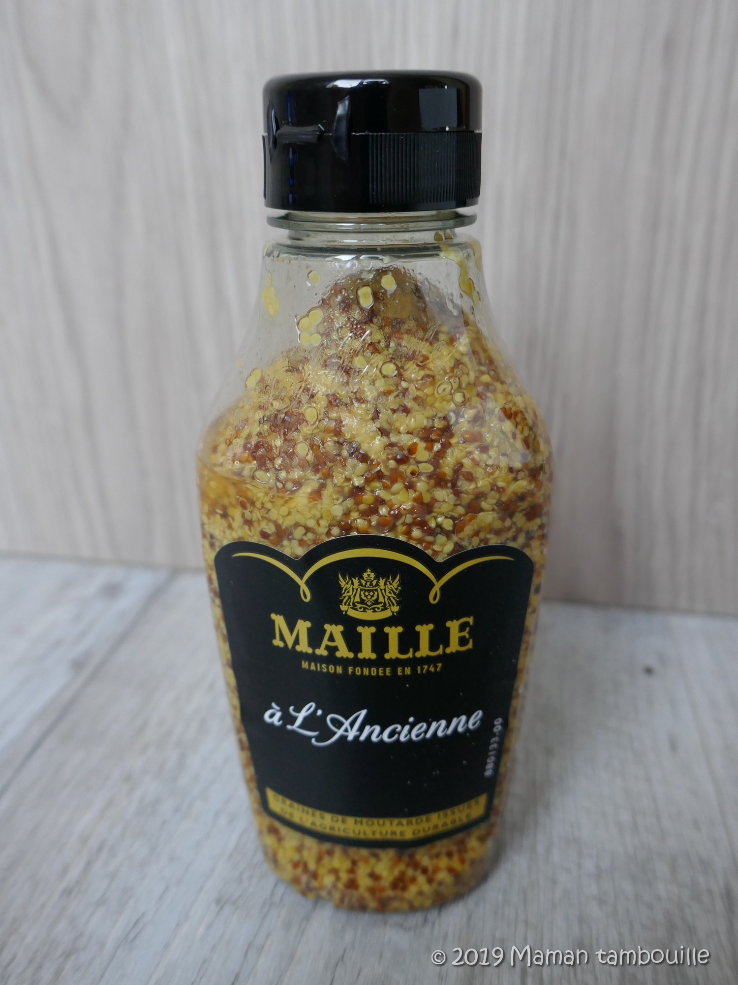 • de la moutarde à l’ancienne Maille en flacon souple. Prix: 2€