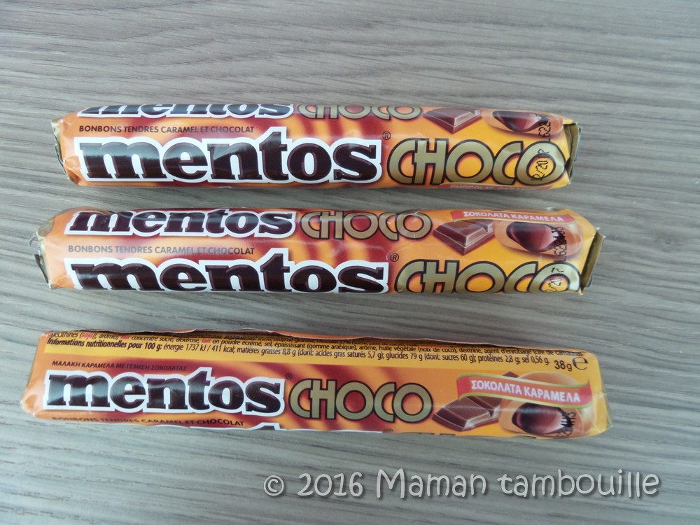 – 3 tubes de Mentos Choco cœur caramel. Prix: 1€ x 3