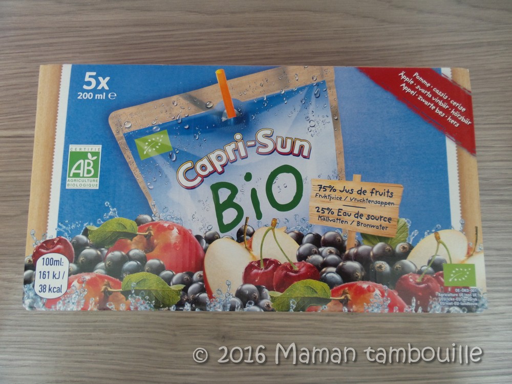 • une boite de 5 gourdes Capri Sun Bio pomme cassis cerise. Prix: 2,35€
