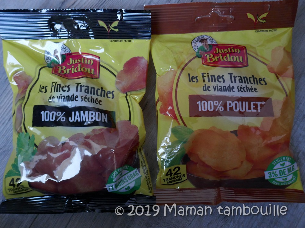 - des fines tranches de viande séchée (jambon et poulet) Justin Bridou. Prix: 2€29 le paquet