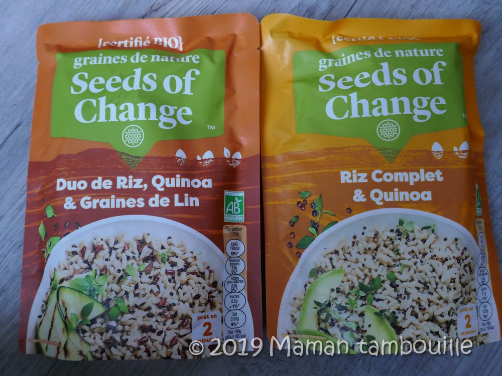 - 2 sachets Seeds Of Change « duo de riz et quinoa », « riz complet et quinoa ». Prix: 2€49 l’unité (Les abonnés ont reçu aléatoirement un seul des 2 sachets)