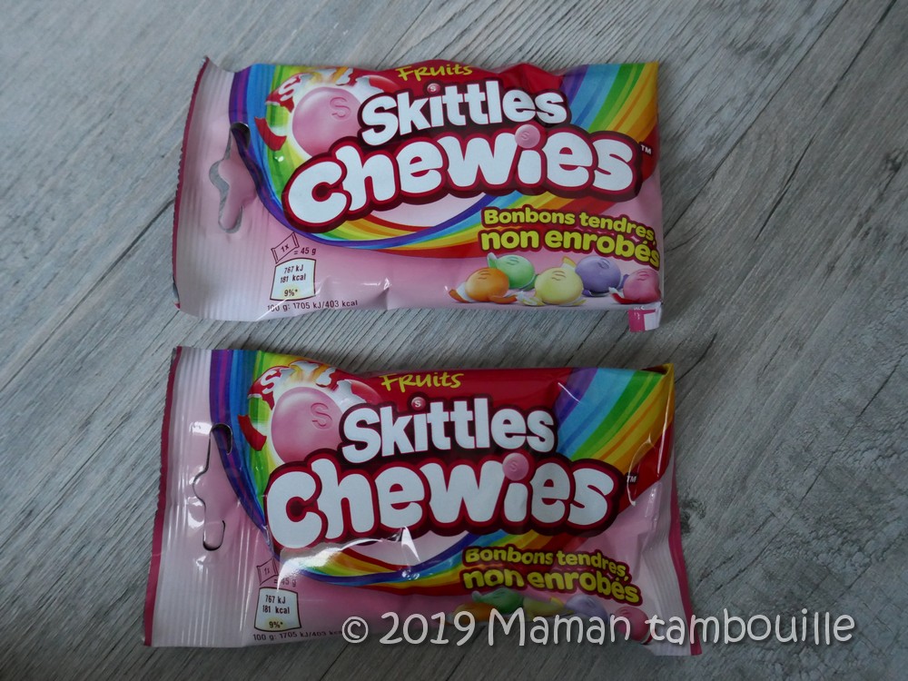 - 2 sachets de Skittles chewies. Prix: 1€ le sachet