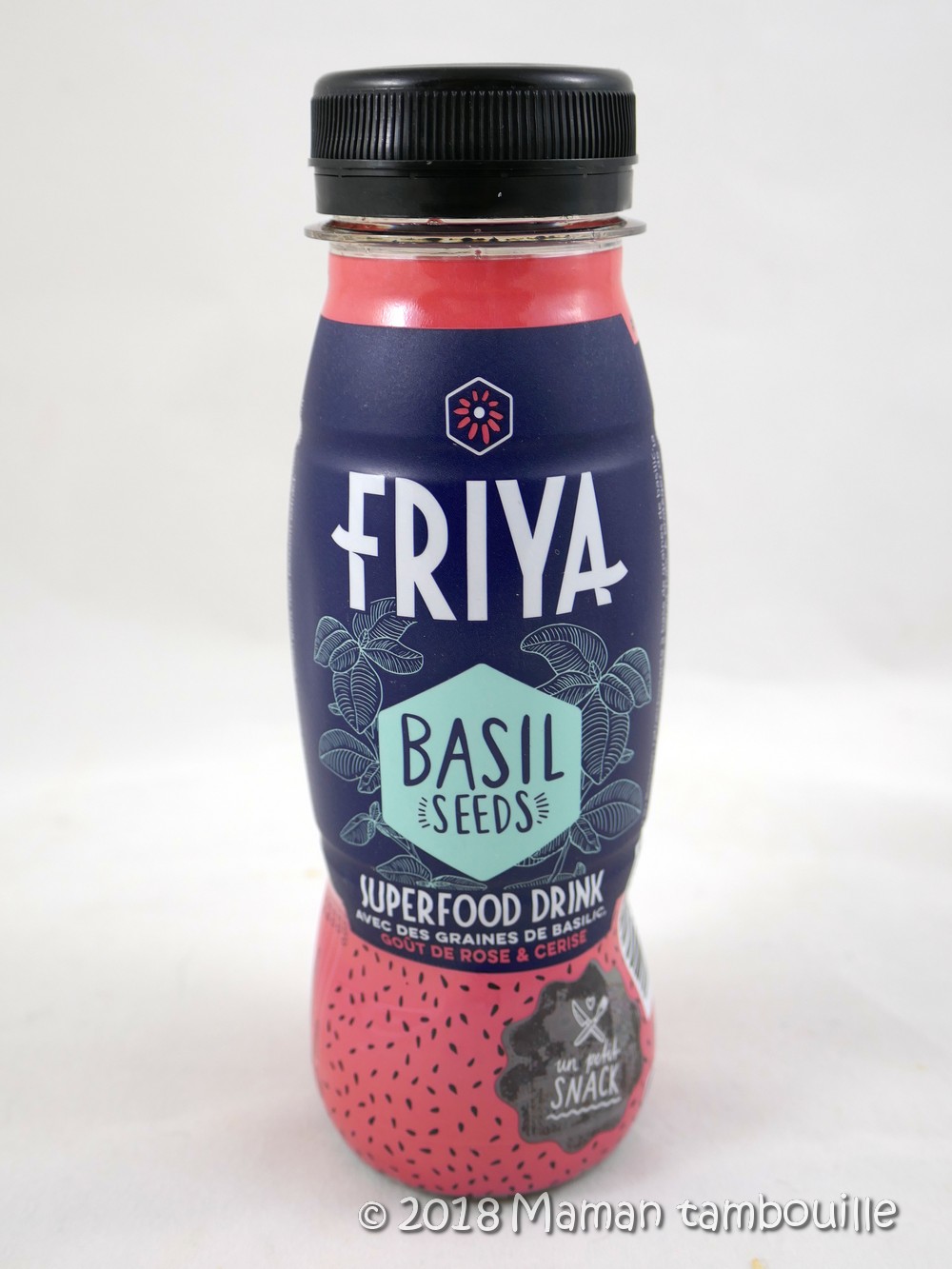 - une bouteille de boisson aux superfruits, avec des graines de basilic et un goût Rose & cerise Friya. Prix: 2€20
