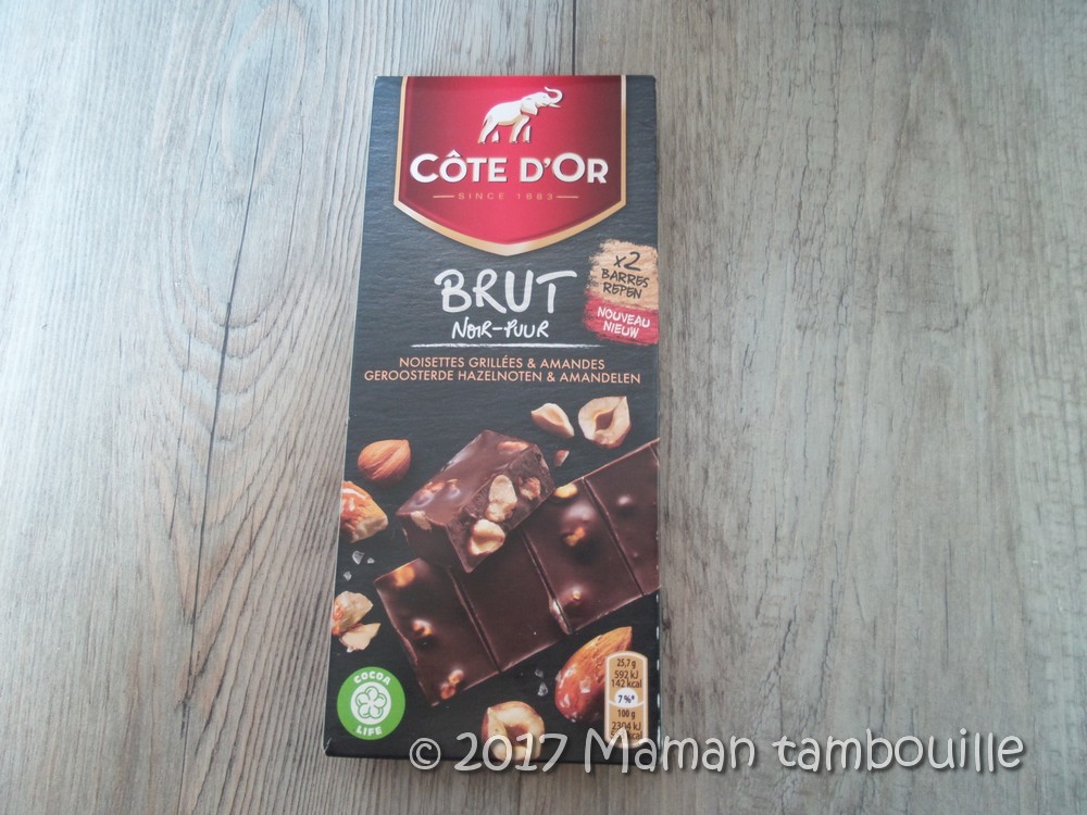 • Une tablette de chocolat noir brut noisettes et amandes Côte d’Or. Un chocolat bien épais, brut de brut, j’ai beaucoup aimé. Prix: 3€29