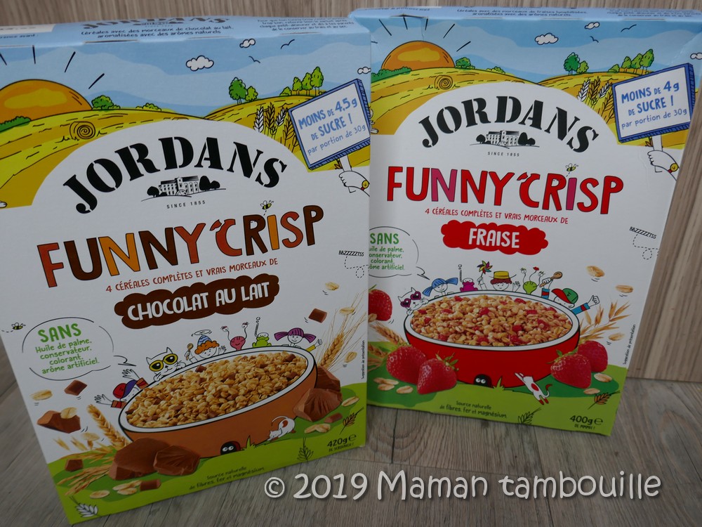 • des céréales Jordans Funny Crisp à la fraise ou au chocolat. Prix: 3€49 l’unité.