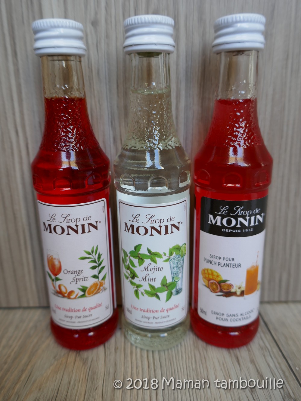 • des petites bouteilles de sirop Monin. Prix: 2€80 l’unité (33cl) (dans les box sans alcool uniquement)
