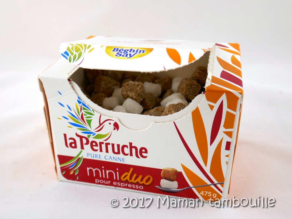- une boite de mini sucres blancs et roux La Perruche. Prix: 1€89
