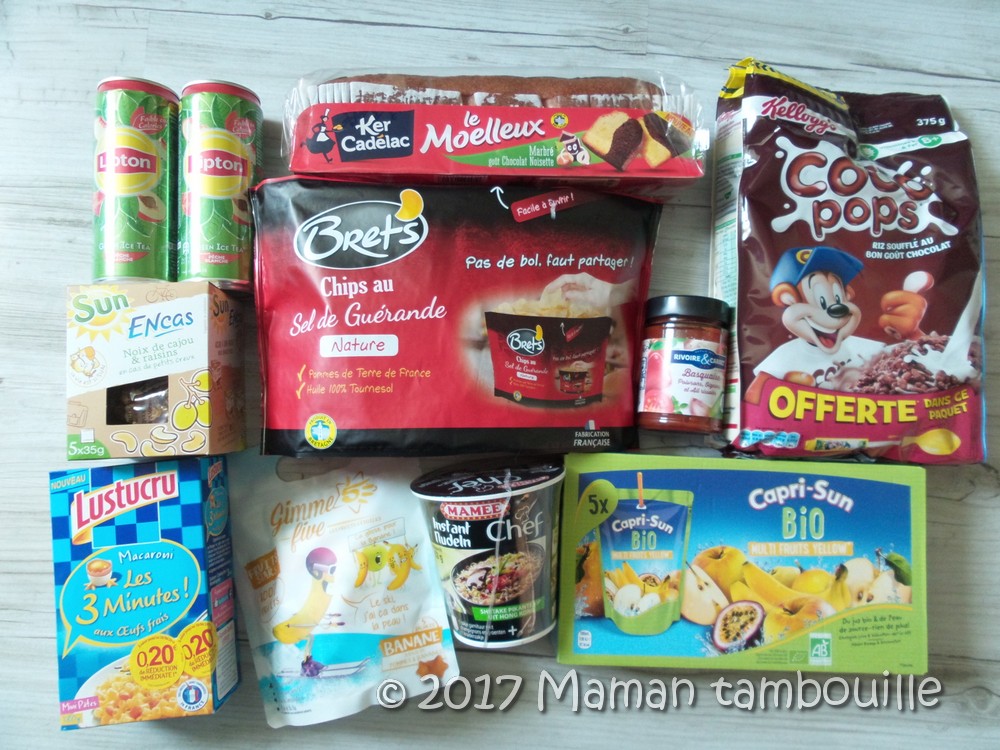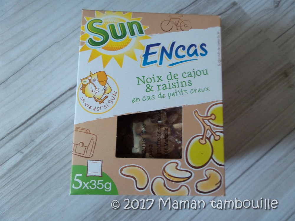- des sachets de noix de cajous et raisins Sun. Prix: 3€45