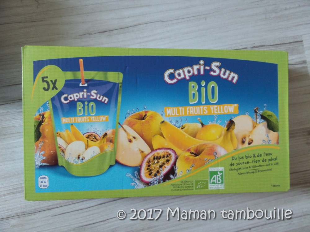 - des gourdes Capri-Sun Bio multi fruits. Du jus de fruits bio, de l’eau de source et pas de sucres ajoutés. Prix: 2€45