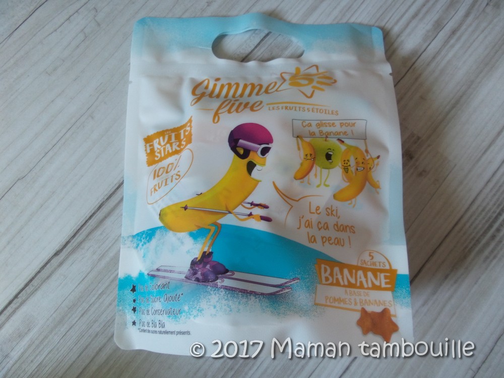 - des sachets de « friandises » aux fruits Gimme Five sans colorants, sans sucres ajoutés, sans conservateurs, sans gélatine animale … Prix: 3€79