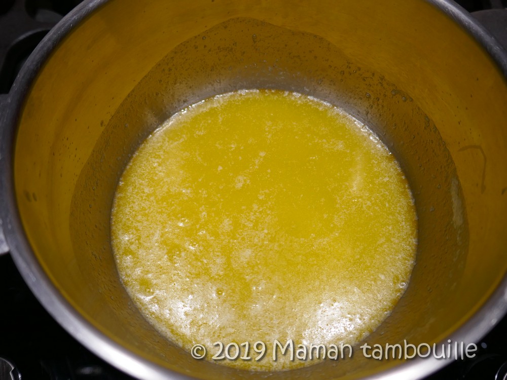 Mettre le beurre dans une casserole et chauffer à feu moyen. Quand le beurre mousse, qu’il a arrêté de crépiter et a pris une couleur noisette claire, arrêter le feu et verser dans un bol. Laisser refroidir/tiédir à température ambiante.