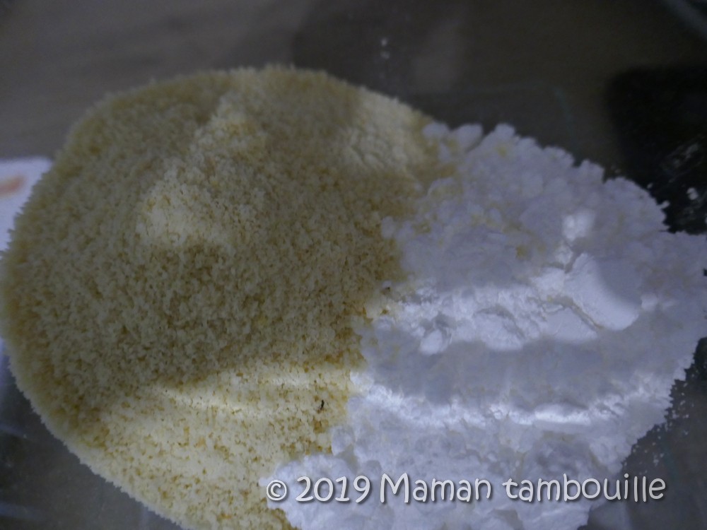 Dans un saladier, mélanger le sucre glace, la farine et la poudre d’amande.