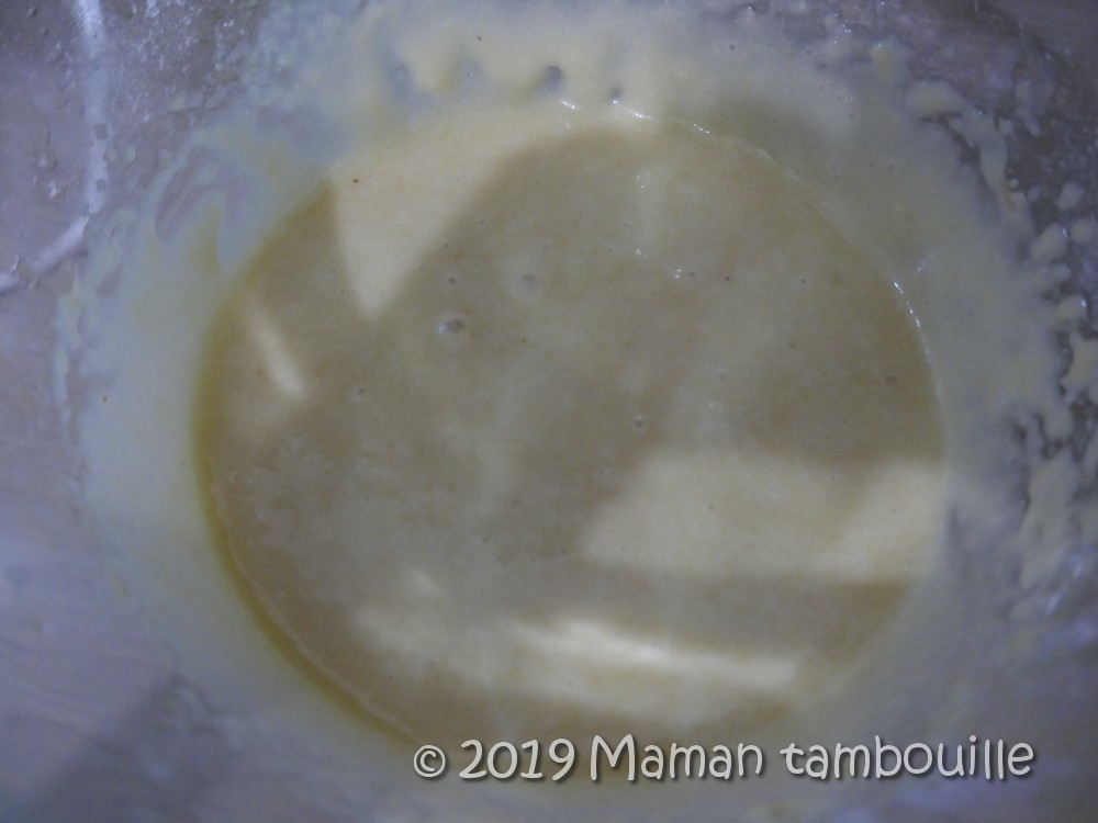 Filtrer le beurre fondu dans une passoire fine et verser dans le mélange précédent.