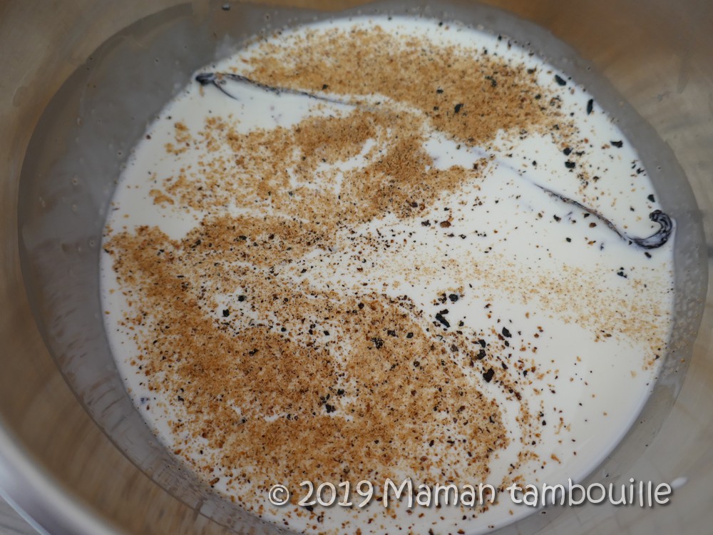 Dans une casserole, mettre 150ml de lait, 150ml de crème, la gousse de vanille fendue et égrainée, la fève tonka râpée. Porter à ébullition puis couper le feu, couvrir et laisser infuser 1h.