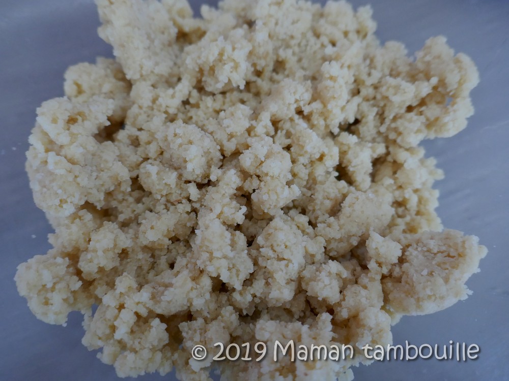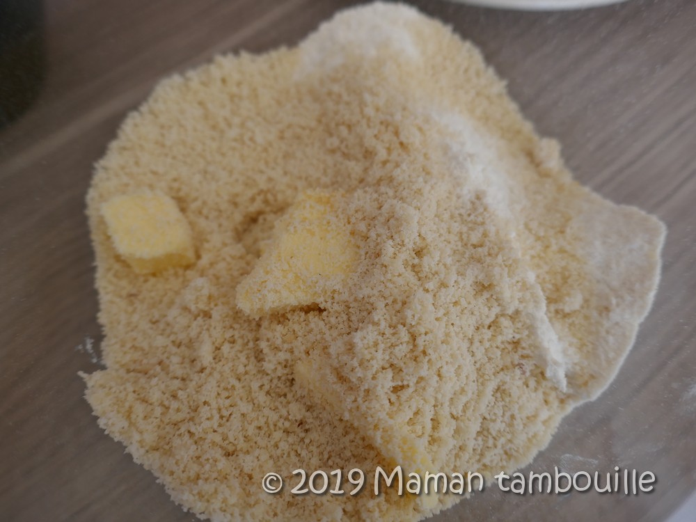 Dans un saladier, mélanger du bout des doigts la cassonade, le beurre froid coupé en cubes, la poudre d’amande et la farine.