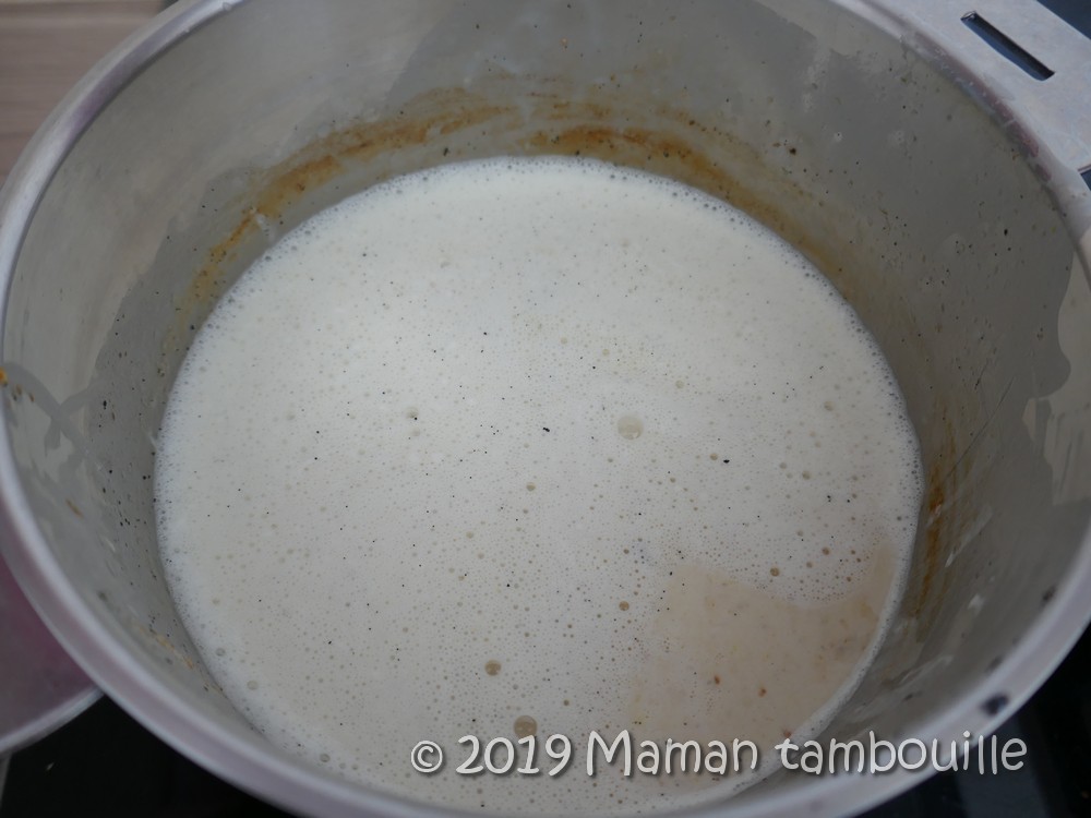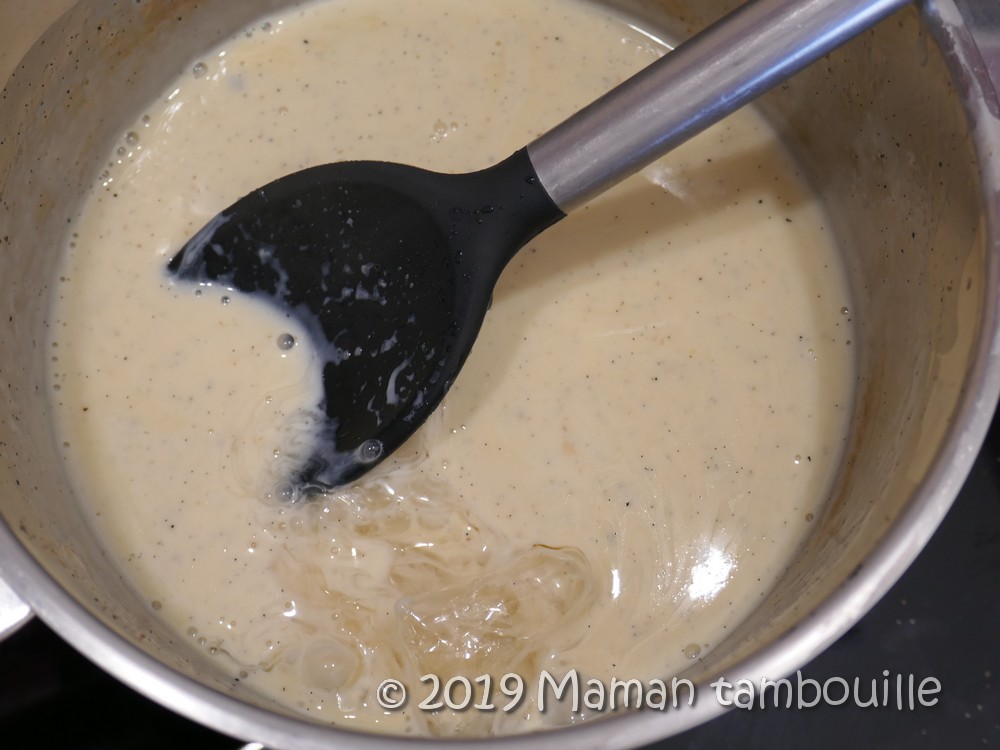 Remettre la crème vanille à chauffer puis verser dans le mélange oeuf/jaune tout en fouettant.