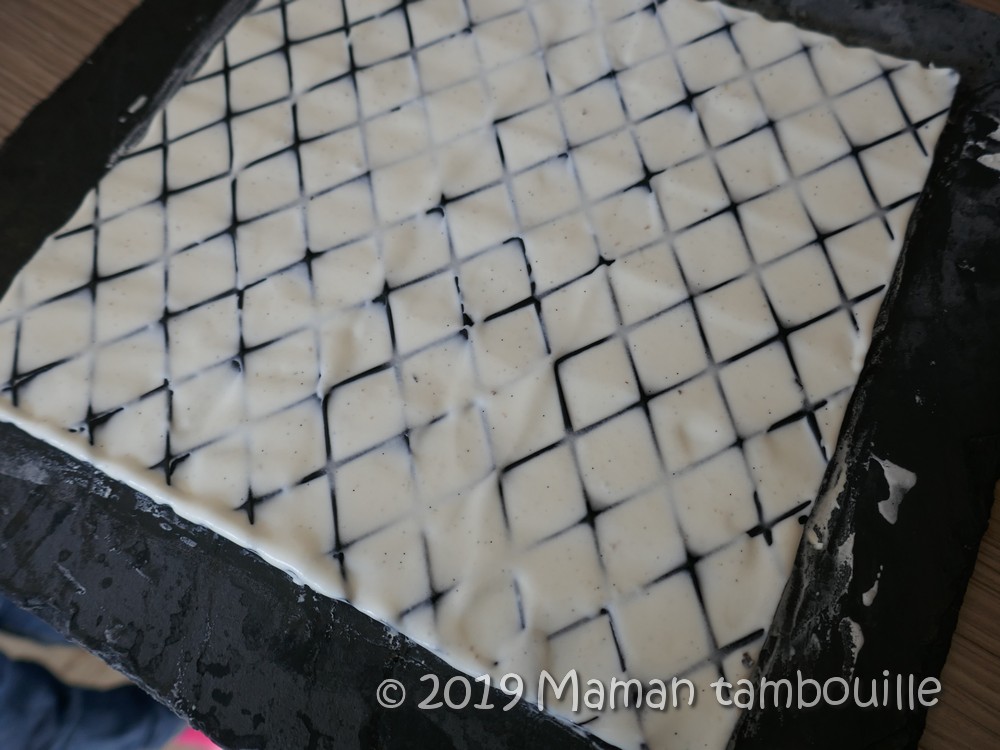 Mettre la plaque décor dans le fond du moule puis verser la moitié de la crème. Etaler.
