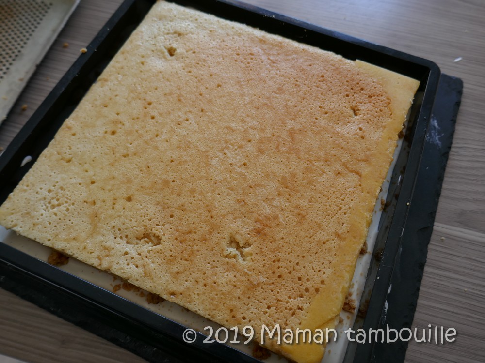 Retourner le biscuit et couper 1 cm en longueur et en largeur pour qu’il soit un peu plus petit que le moule.