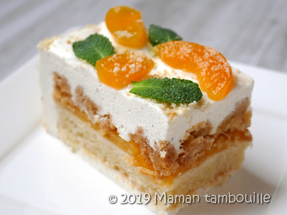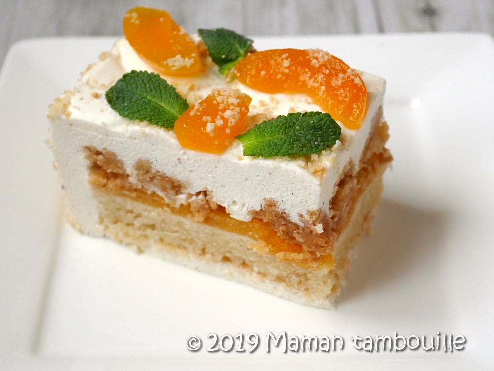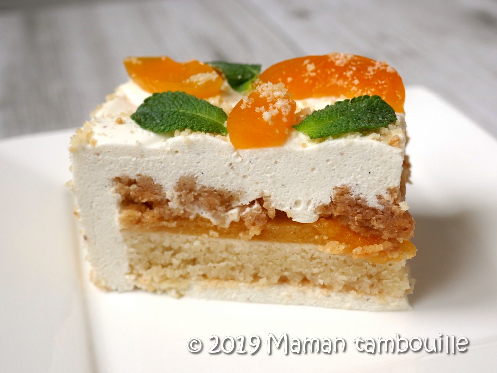 Voilà quelque temps que je n’avais pas d’entremets. Pour cette fois, j’y suis allée à l’impro en essayant d’associer des saveurs qui se marient bien. Ici, ce sera abricot et amande avec une mousse vanille/tonka.