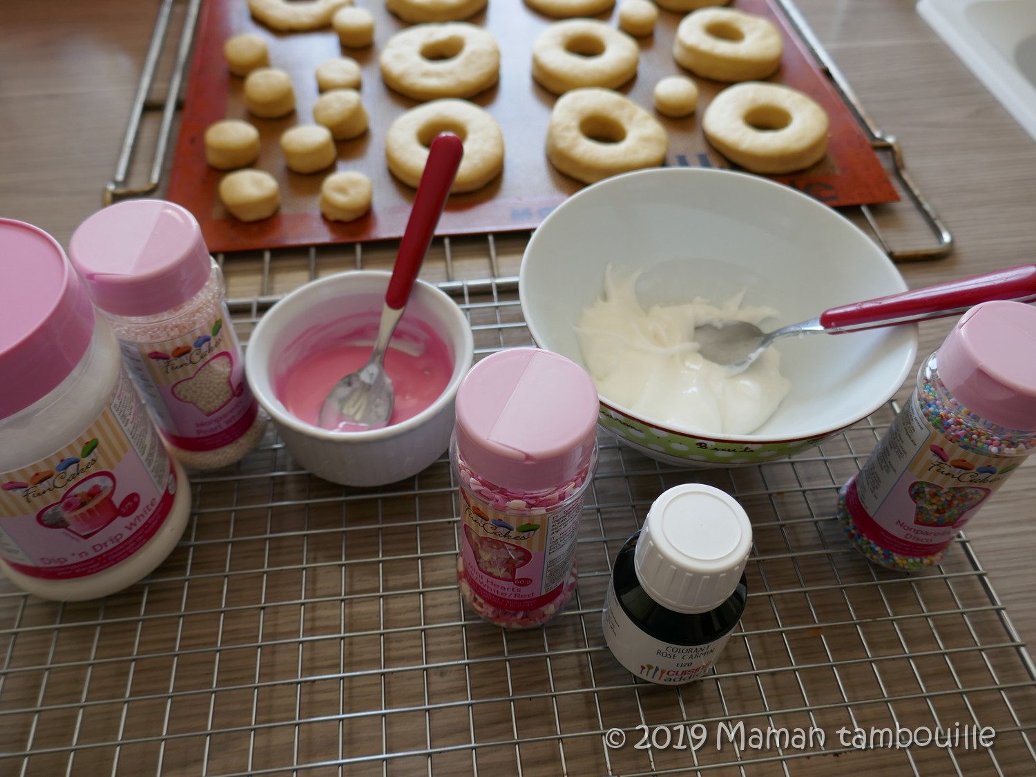 Les tremper d’un côté dans le glaçage en veillant à bien couvrir le dessus sans mettre trop d’épaisseur non plus. Saupoudrer de décors immédiatement. Les billes nacrées ont très bien accroché en saupoudrant. Pour les coeurs et les billes multicolores, elles tenaient moins bien alors j’en ai mis un peu dans le fond d’une assiette et j’ai retourné les donuts glacés dessus.