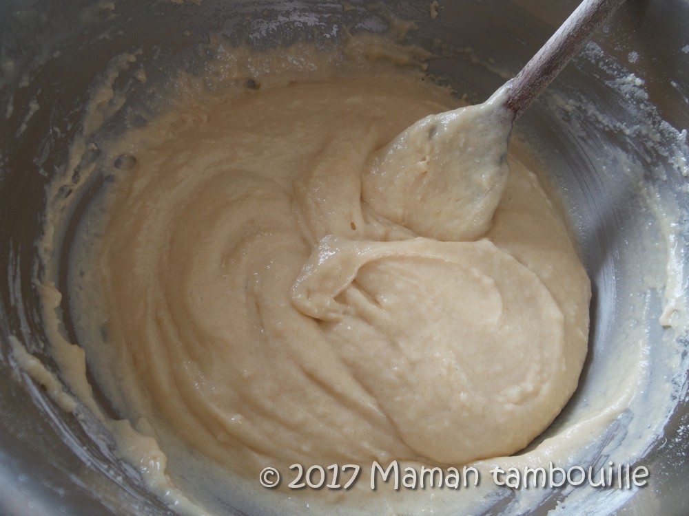 Mélanger rapidement avec une cuillère sans excès. Dès que les ingrédients sont intégrés, on arrête de mélanger, pas grave s’il reste des grumeaux.
