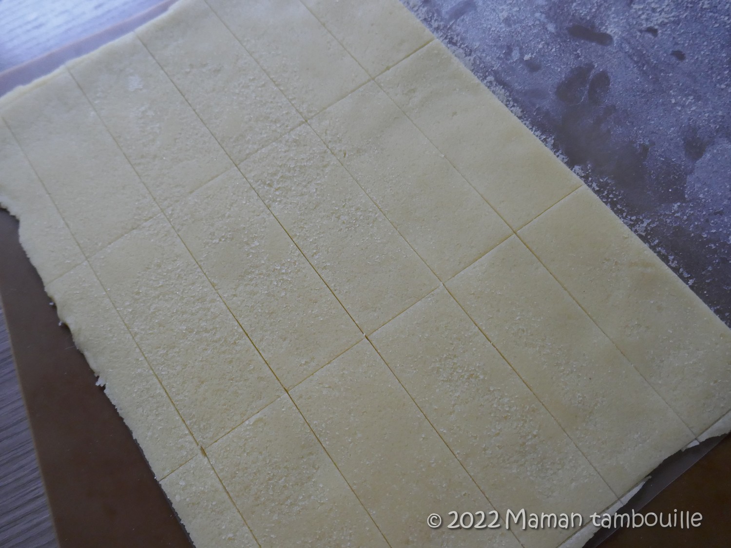 Enfourner 15 min à 160°. Si les rectangles se sont un peu étalés, « prédécouper » les bords avec un couteau dès la sortie du four sans décoller les sablés. Laisser refroidir avant de décoller de la plaque.