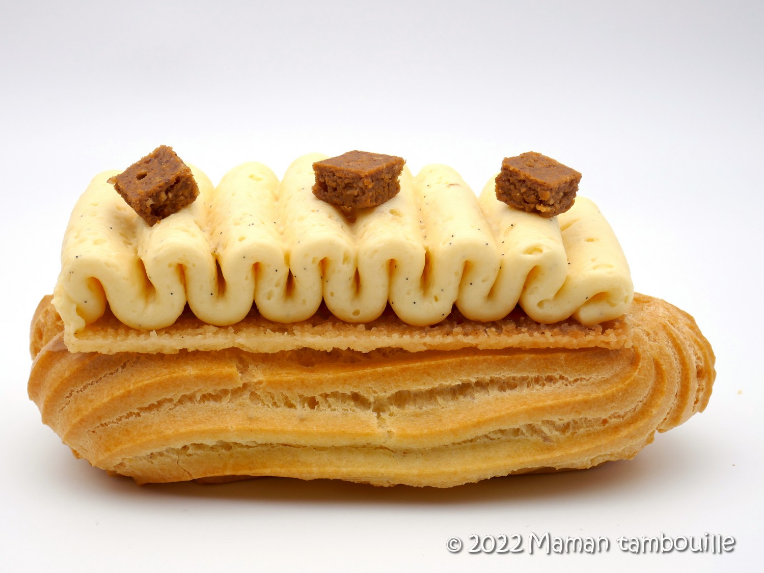 Un petit air de Paris Brest que ces éclairs tout beaux tout gourmands. Ils sont remplis à l’intérieur d’une ganache montée praliné et d’un filet de pâte de praliné. J’ai déposé dessus un fin biscuit sablé sur lequel j’ai poché une crème mousseline à la vanille puis déposé quelques cubes croustillants pralinés.