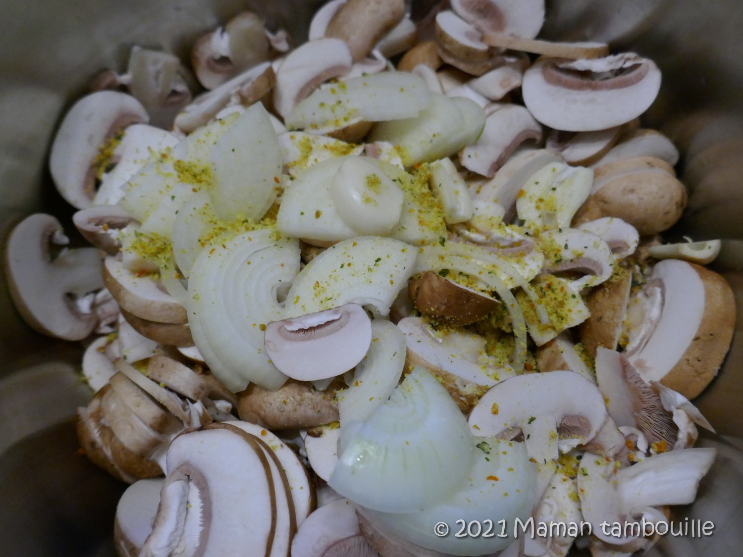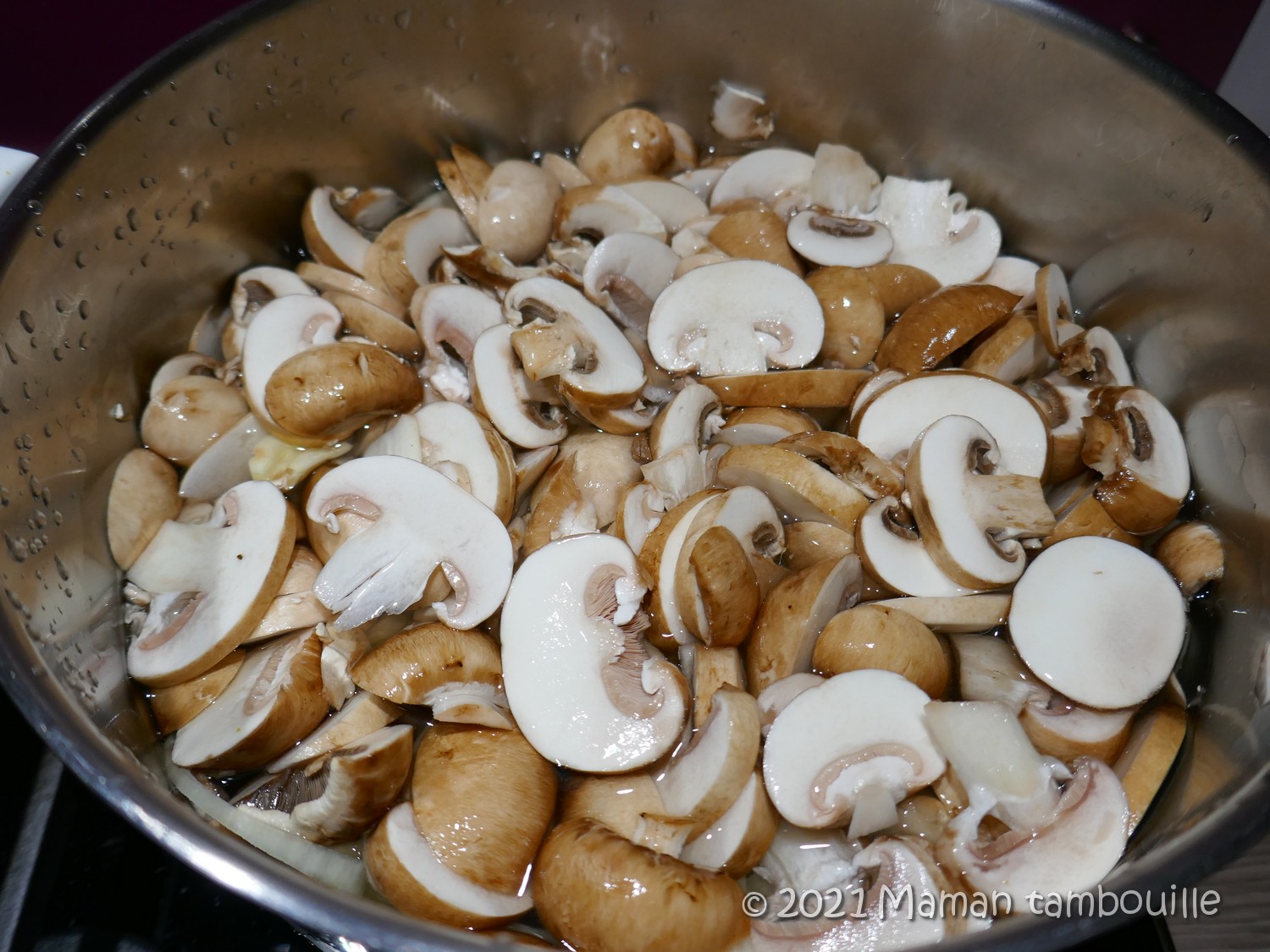 Note: Il reste les champignons et le reste du bouillon. Les utiliser pour une autre recette. De mon côté, j’en ai fait un velouté de champignons avec un peu de crème pour un autre repas.