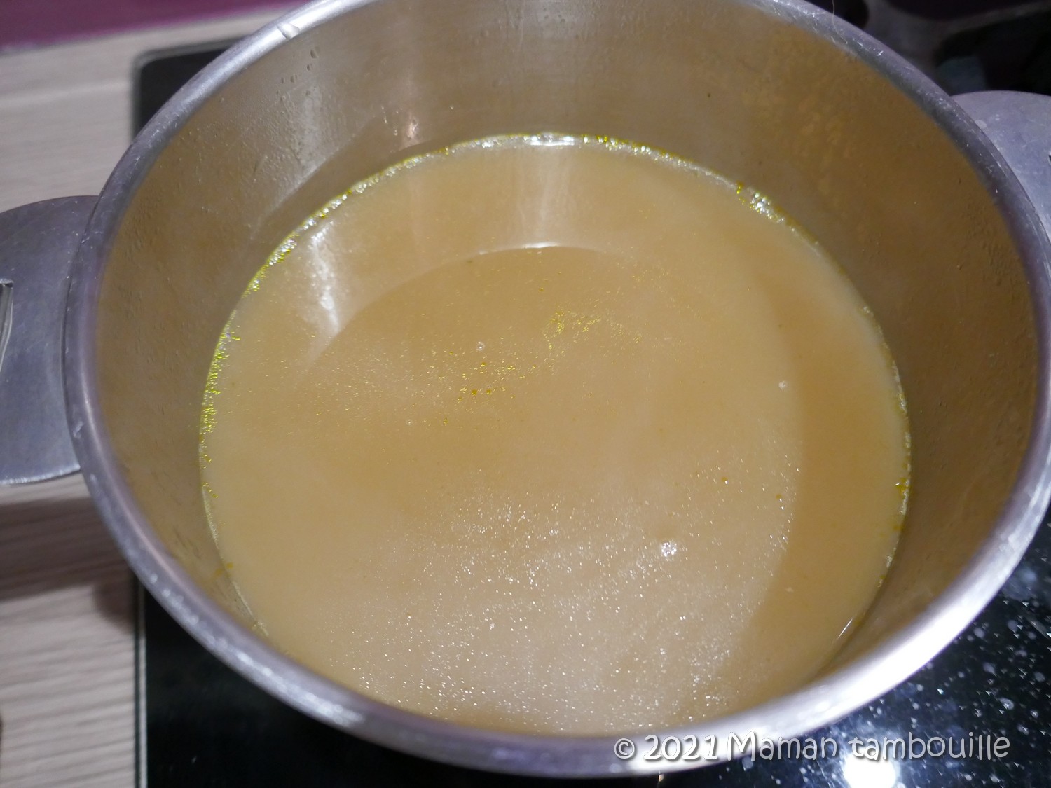 Quand le bouillon est prêt et bien savoureux, filtrer pour récupérer 500g de jus. Mettre dans une grande casserole