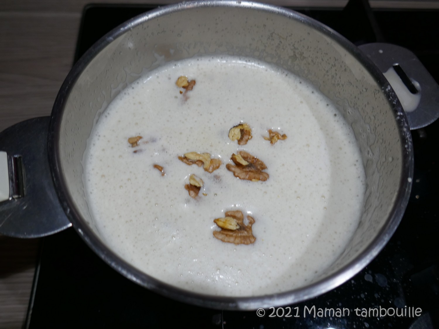 Mixer longtemps avec un mixeur plongeant pour créer une émulsion. Ajouter 40g de noix et mixer à nouveau longtemps. La recette d’origine indique de passer ce bouillon au chinois, je ne l’ai pas fait. Maintenir au chaud.