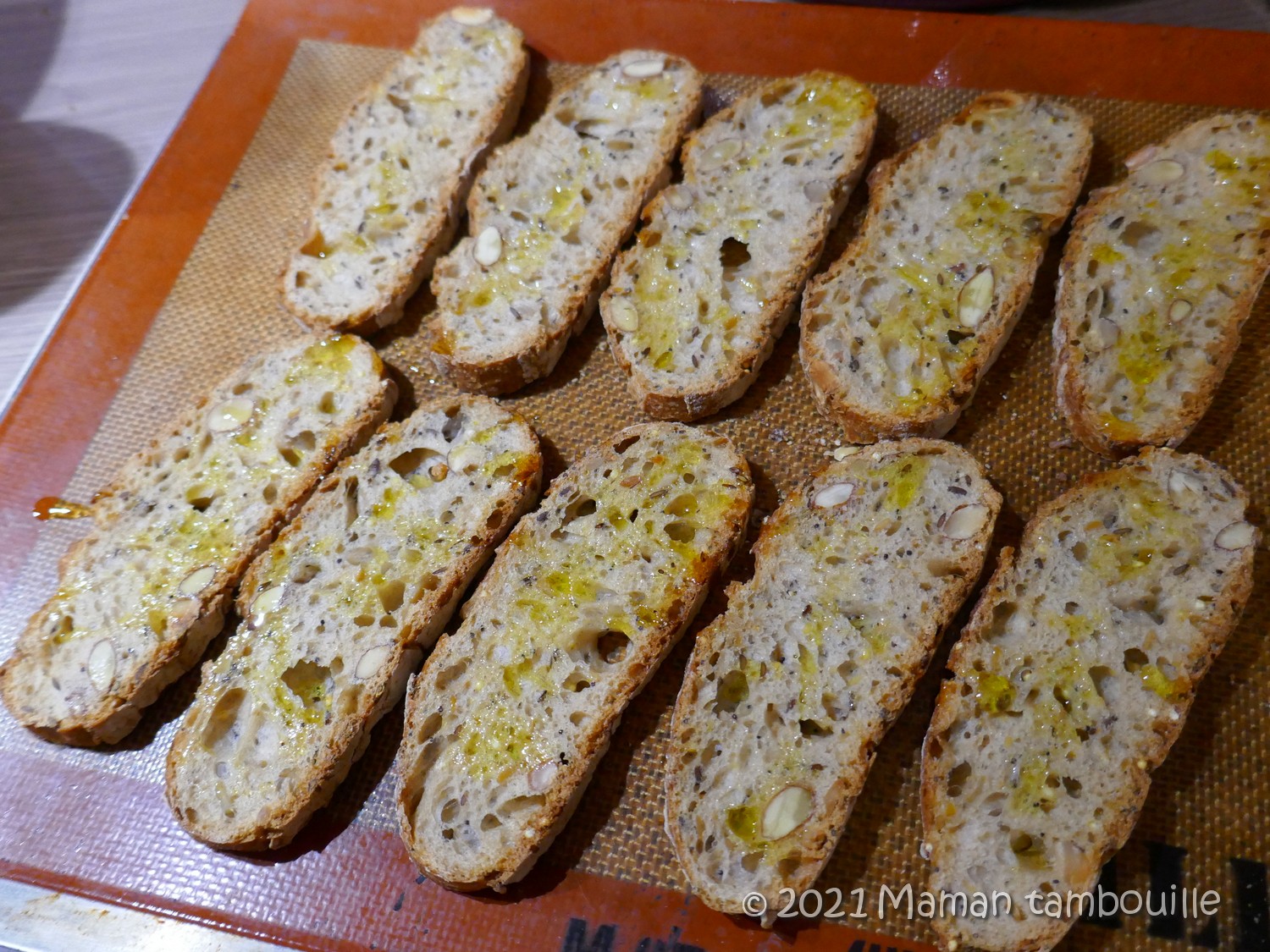 Verser un filet d’huile d’olive sur les tranches de pain et les faire dorer 15 min à 180° en retournant à mi cuisson et en surveillant bien que ça ne brule pas. Le pain doit être bien croustillant. Réserver.
