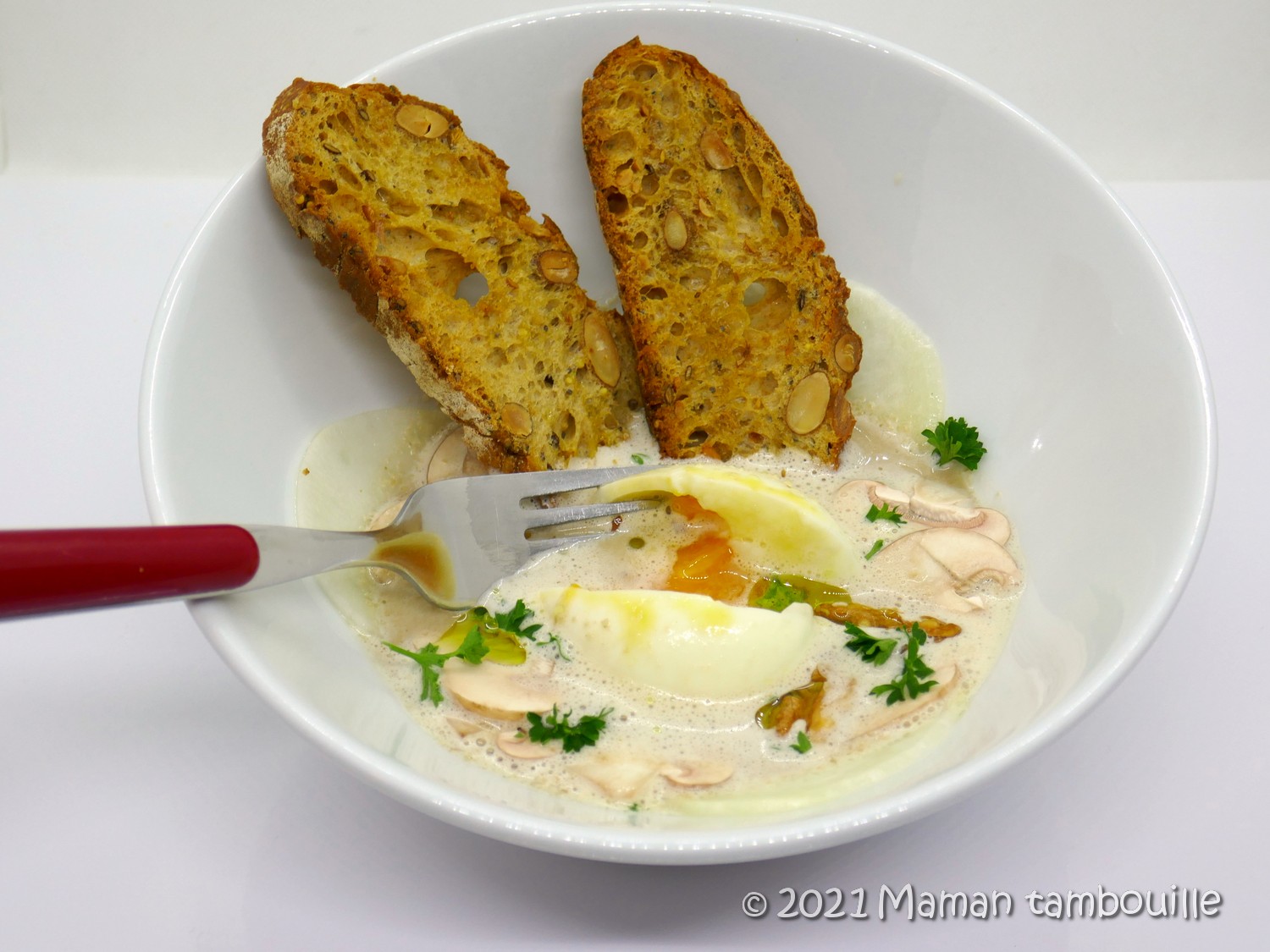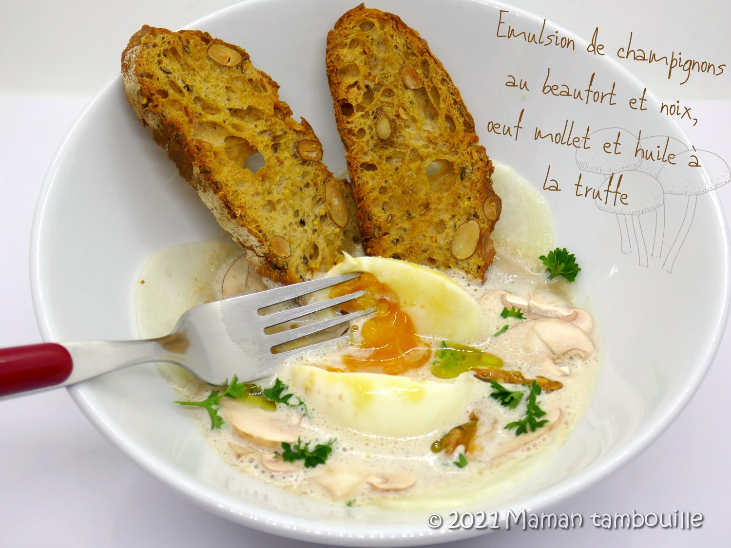 J’aime beaucoup ce genre d’assiette, légère et gourmande à la fois. C’est simple mais finalement assez raffiné offrant un petit air de restaurant: un bouillon de champignons bien parfumé émulsionné avec du beaufort et noix, un oeuf mollet et quelques gouttes d’huile à la truffe.