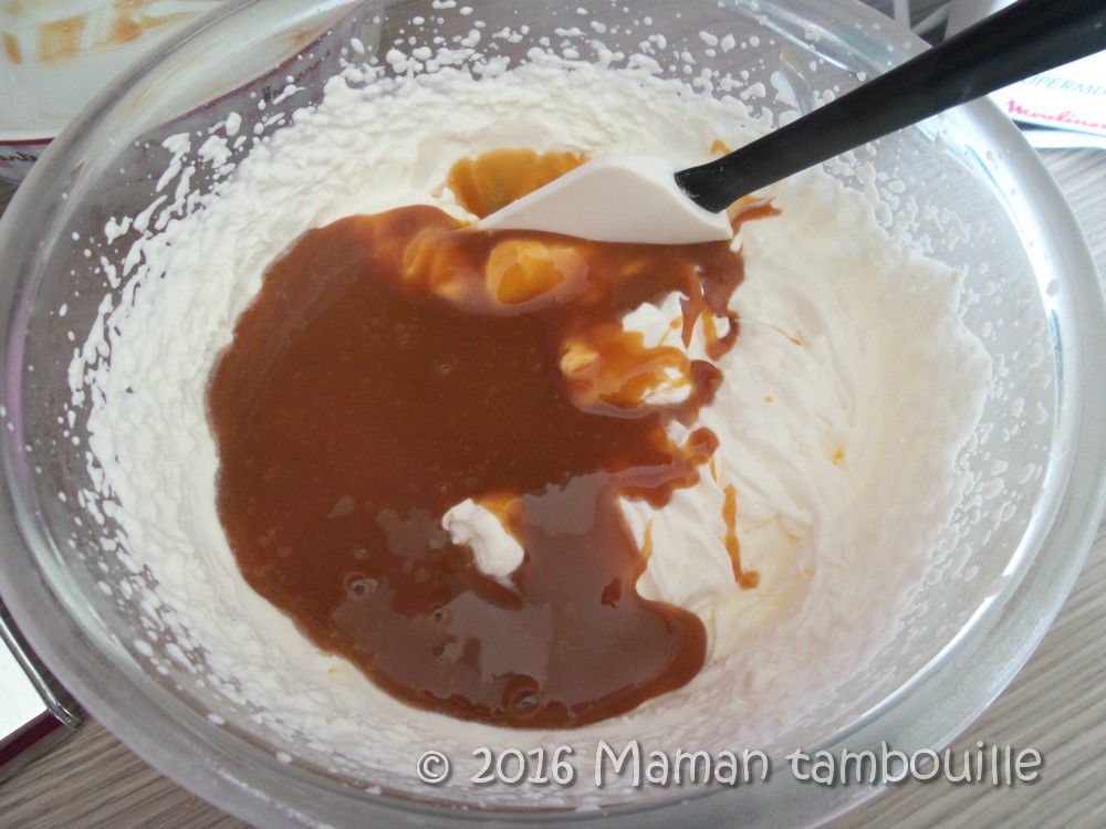 Ajouter dans la crème le caramel bien tiédi, presque refroidi.