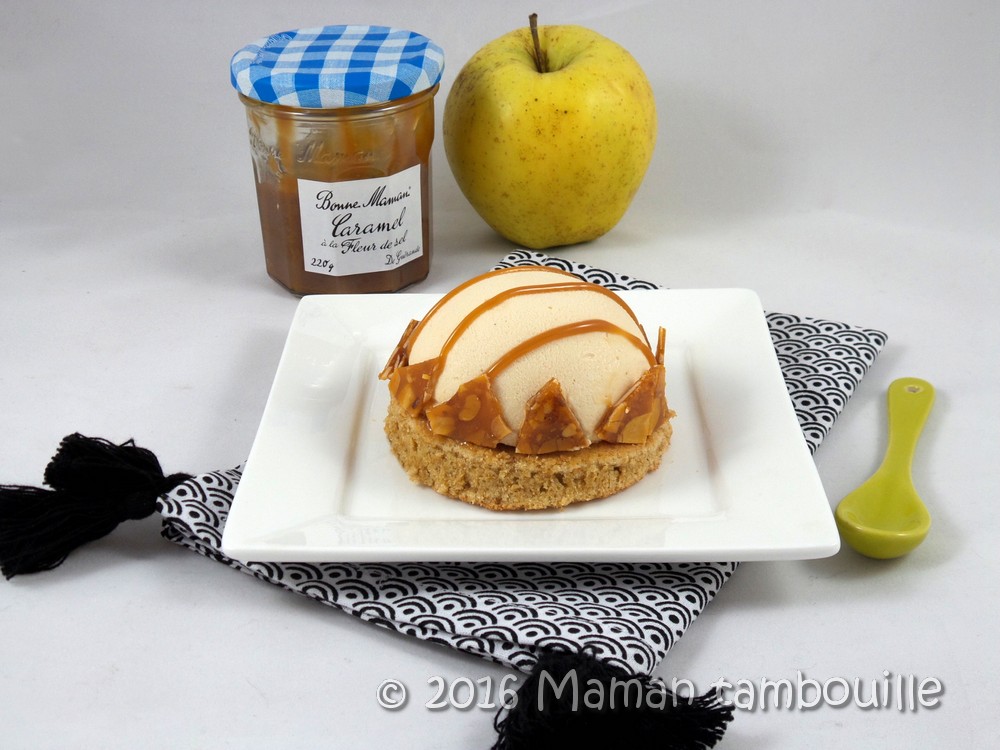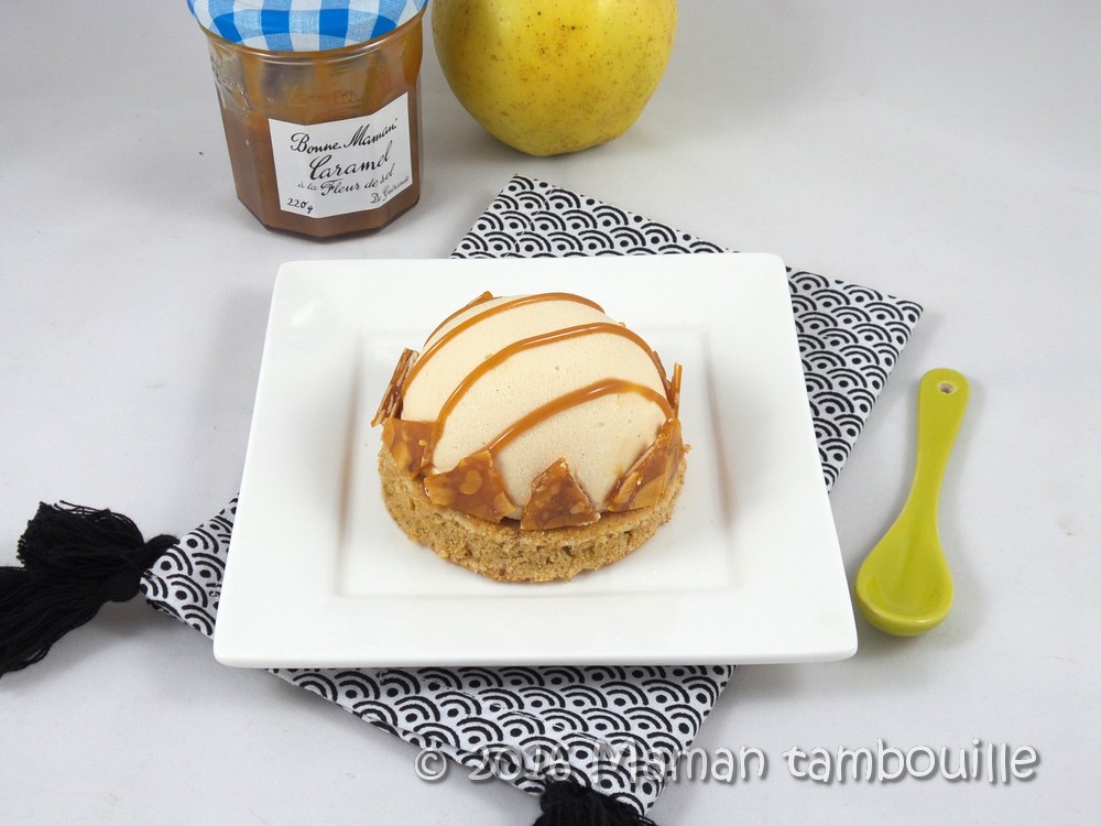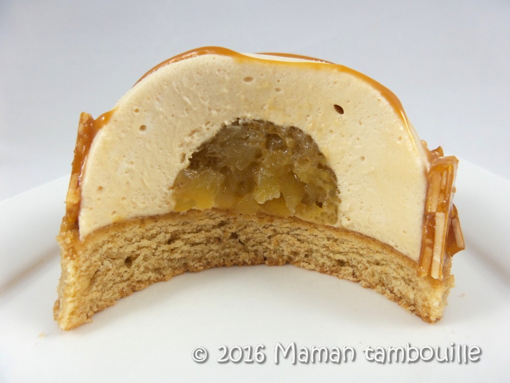 Un très bon petit entremet improvisé un peu au feeling qui s’est avéré réussi. A la base, je voulais utiliser le caramel au beurre salé Bonne Maman reçu dans la dernière Degustabox tout en préparant un dessert sympa et un peu élaboré. J’ai pensé à un entremet au caramel et puis la suite la venue: une base gâteau aux speculoos, des éclats de nougatine (parce que je n’en avais jamais fait et que je voulais essayer depuis longtemps, recette à venir !), un insert à la pomme pour casser un peu le côté sucré et des traits de caramel pour la gourmandise.