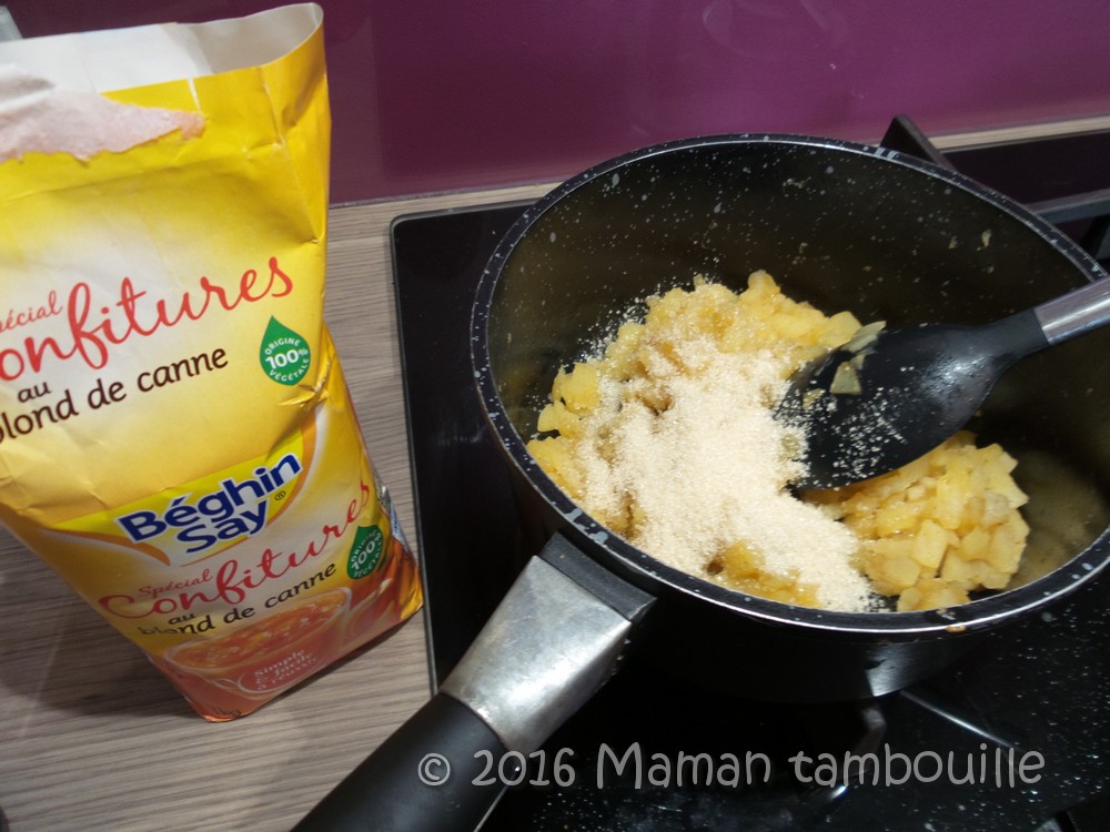 Laisser compoter. Quand les pommes sont fondantes, ajouter le sucre à confiture et laisser cuire 2 min.