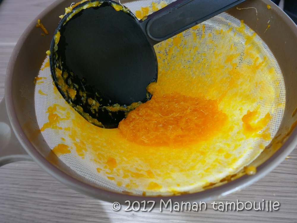 Comme je voulais une compotée très fine, j’ai passé le tout au chinois (à la passoire pour moi) pour ne garder que la pulpe. Honnêtement, c’est un peu pénible à faire et je ne suis pas certaine que ce soit très utile finalement, à vous de voir.