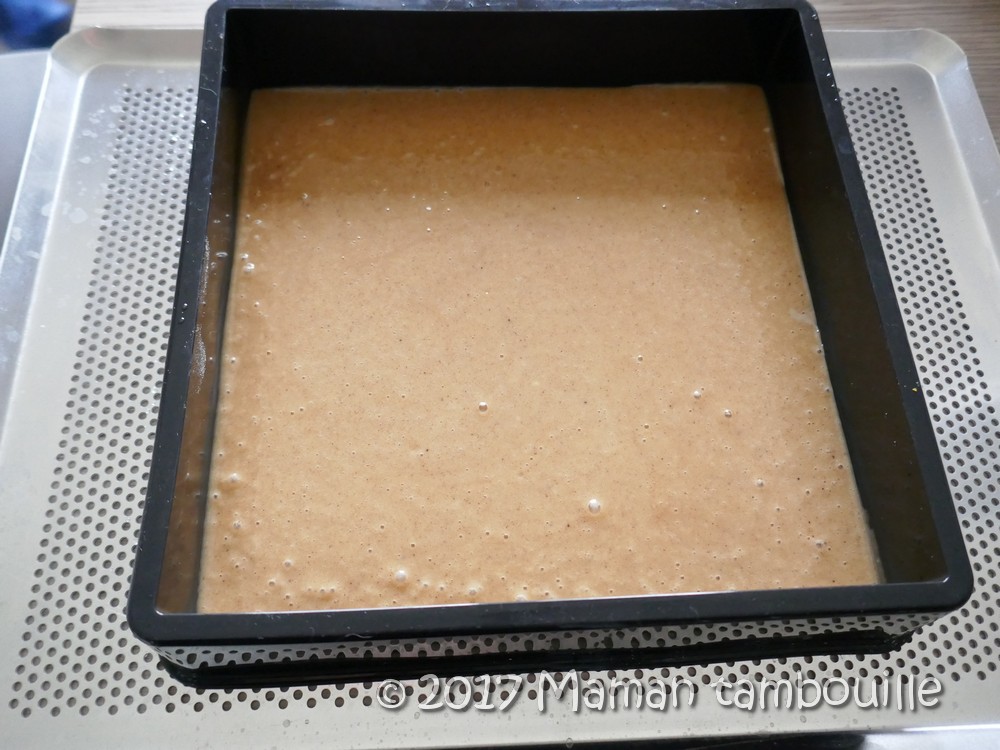 Verser dans un moule carré de 22×22 cm. Si c’est un moule silicone, pas besoin de beurrer et fariner le plat, dans le cas contraire, beurrer et fariner.
