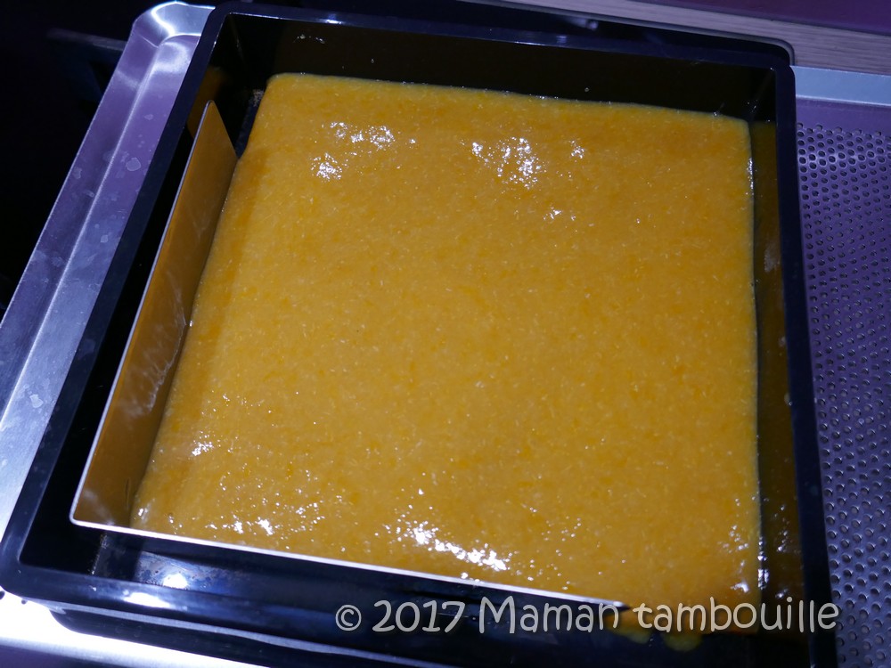 1-Préparation de l’insert clémentine. Vous le coulez dans un cadre couvert de film alimentaire sur environ 0,5mm d’épaisseur et vous mettez en prise en congélateur au moins 4h.