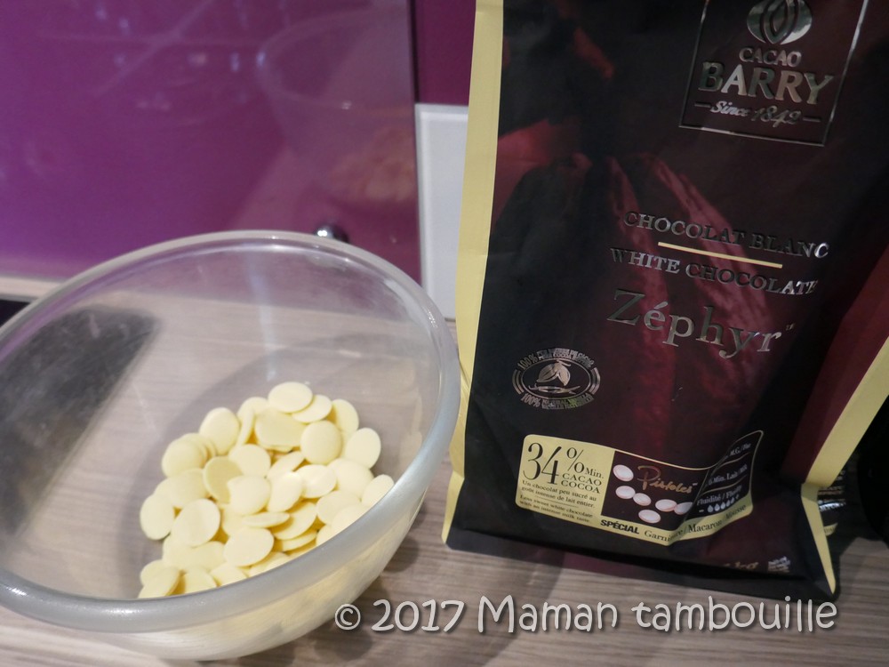 - 180 g de chocolat blanc pâtissier en pistoles (Chocolat blanc Zephyr 34% pistoles 1 kg Barry)
