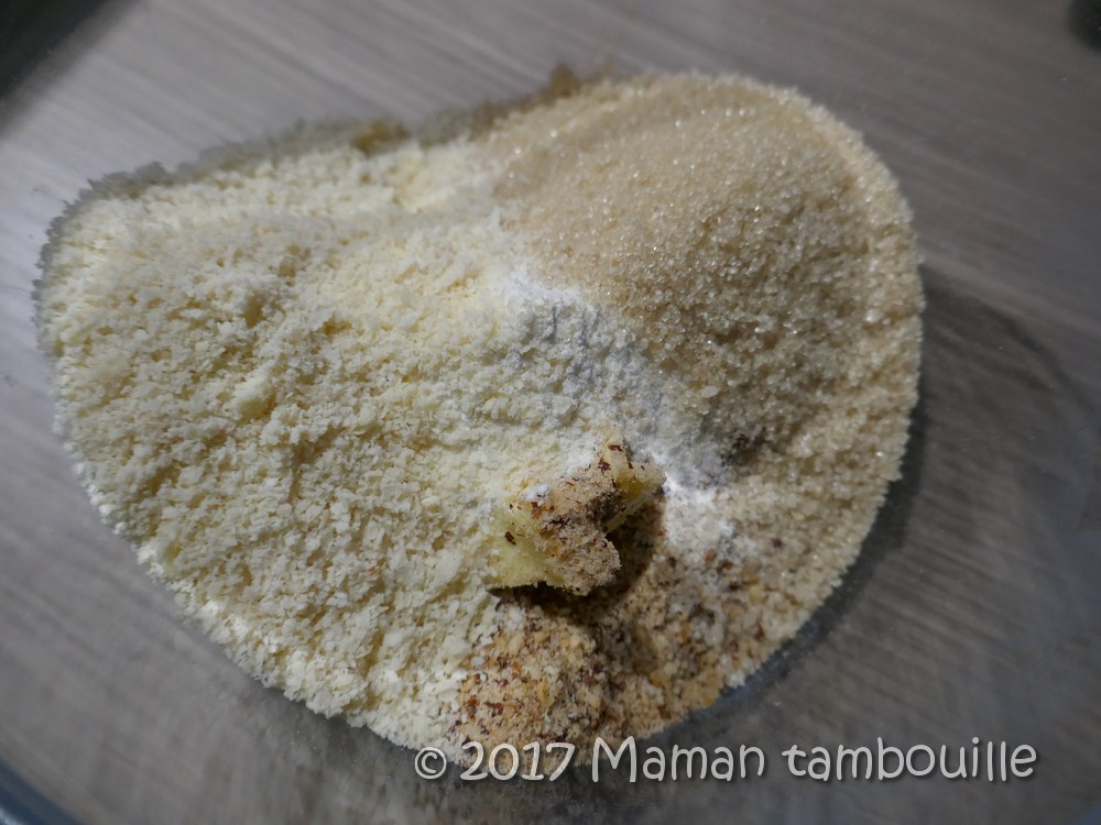 Dans un saladier, mettre la farine, le beurre froid coupé en morceaux, la cassonade, les poudres de noisette et d’amandes.