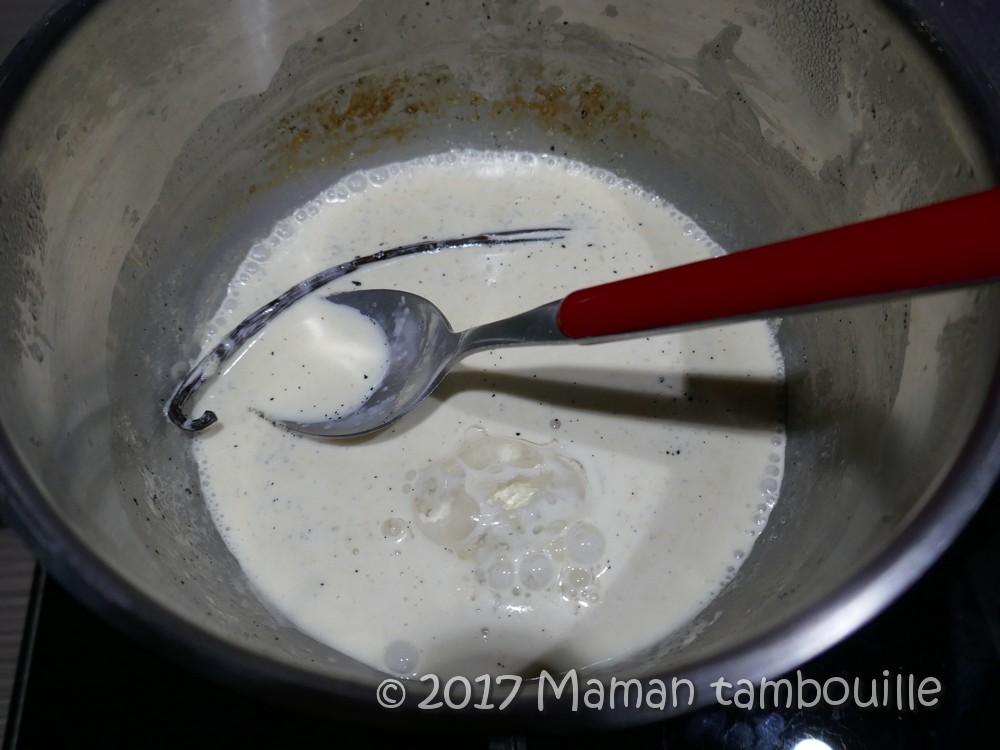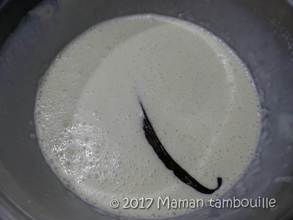 Ajouter les 510g de crème restants et bien mélanger. Remettre la gousse de vanille dans le plat, couvrir et réserver une nuit au frigo.